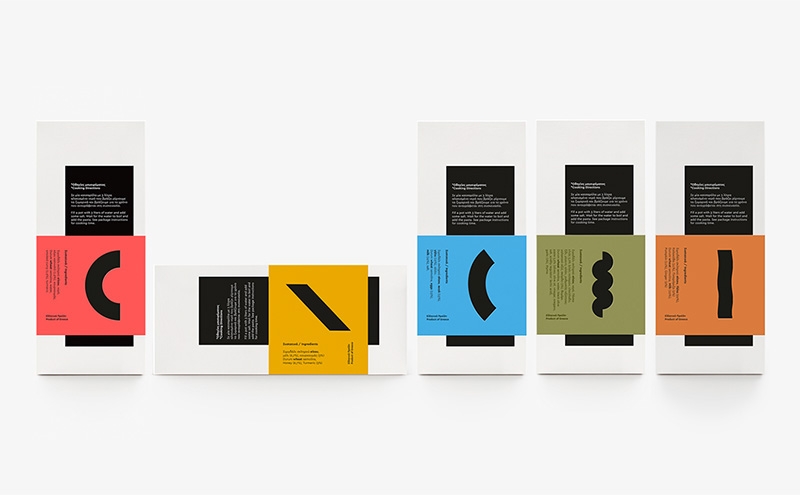這次的包裝設(shè)計(jì)主要是標(biāo)簽的排版設(shè)計(jì),文字的排版以及文字和圖形的排版體現(xiàn)出現(xiàn)代感,我們用五種不同顏色的標(biāo)簽和五種不同形狀的圖形為產(chǎn)品做系列的包裝和種類區(qū)分,消費(fèi)者可以通過不同圖形和窗口設(shè)計(jì)清晰地辨別面的種類。品牌標(biāo)志由線組成的簡單圖形,與面食產(chǎn)品形成對照。