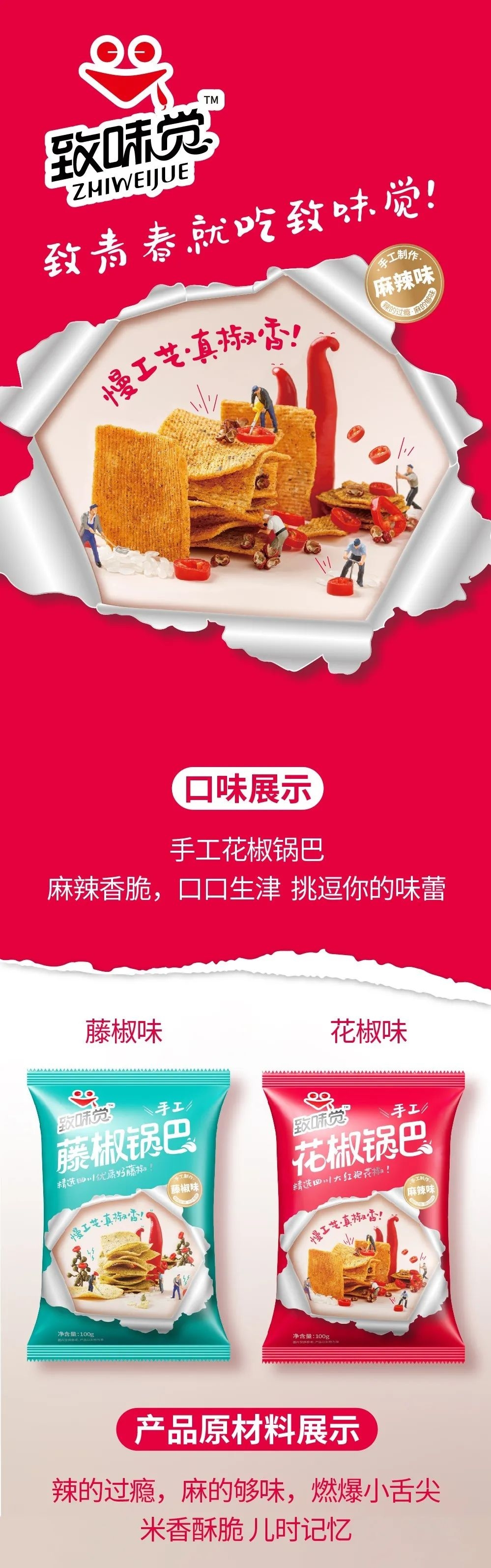致味覺花椒鍋巴也同樣,消費者手中的每一片鍋巴,都是原料挑選、老灶精工、安全裝袋、分揀發(fā)貨等多道工序的最終呈現(xiàn)