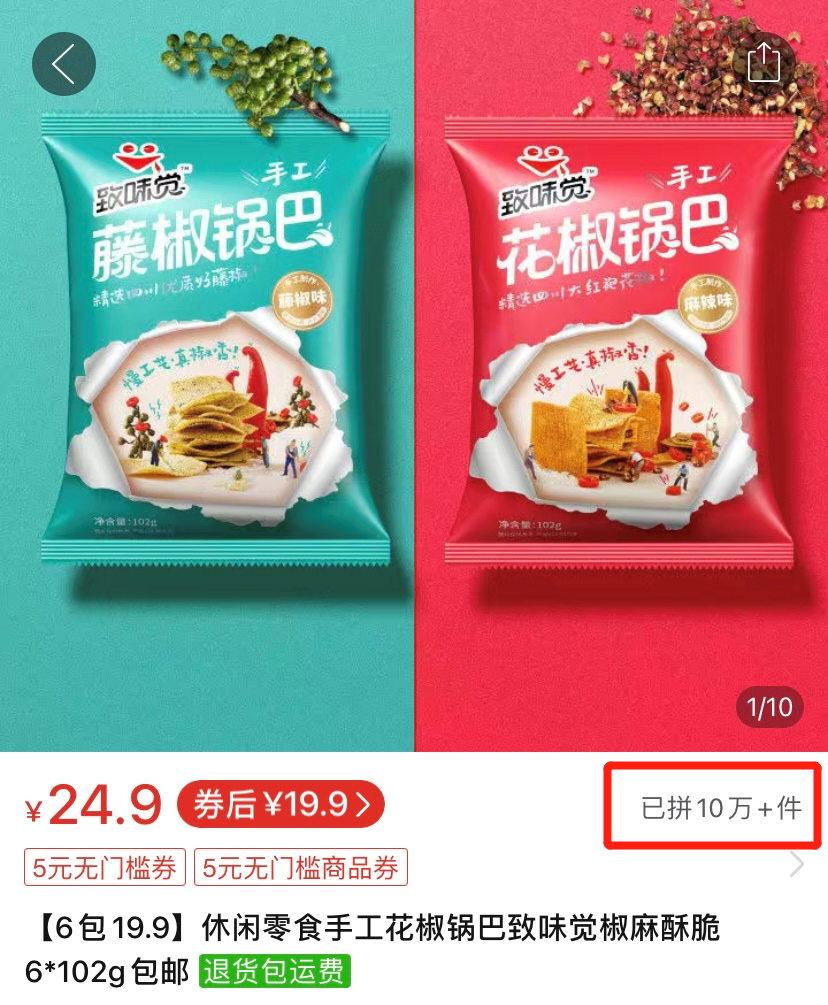 “致味覺”花椒鍋巴一經(jīng)上市,就迅速走紅各個電商渠道,截止文章發(fā)布時銷量已破10W+?。?br />