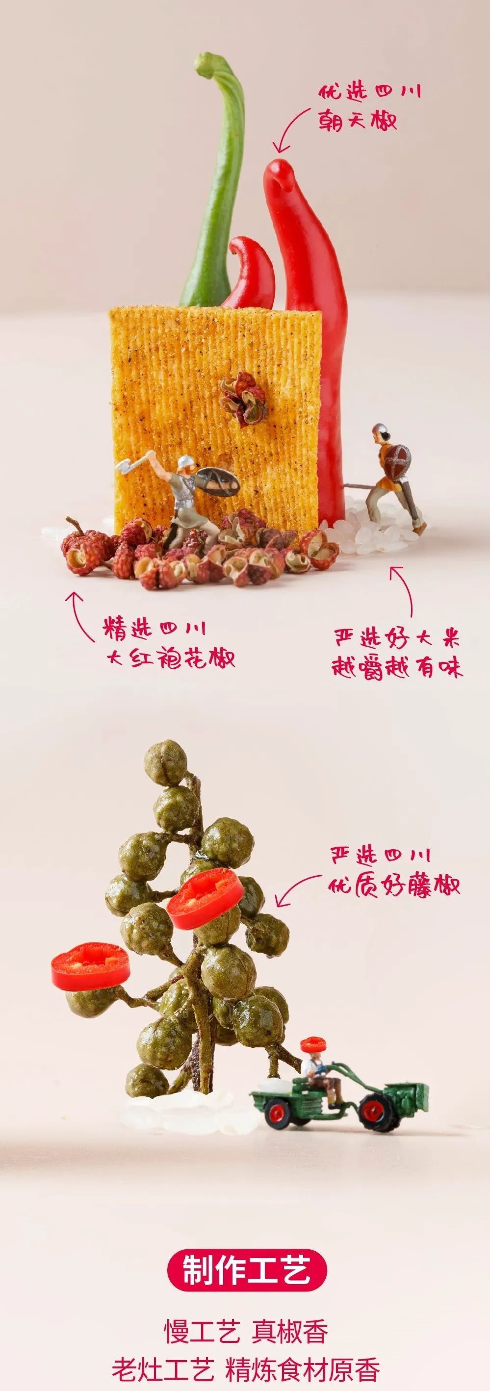 巧妙的袋子破開的視覺設(shè)計,讓視覺自動聚焦在中心區(qū)域,并在此用鍋巴、玩偶以及花椒、辣椒、藤椒、大米等原材料,分別構(gòu)建了兩個不同的微觀場景