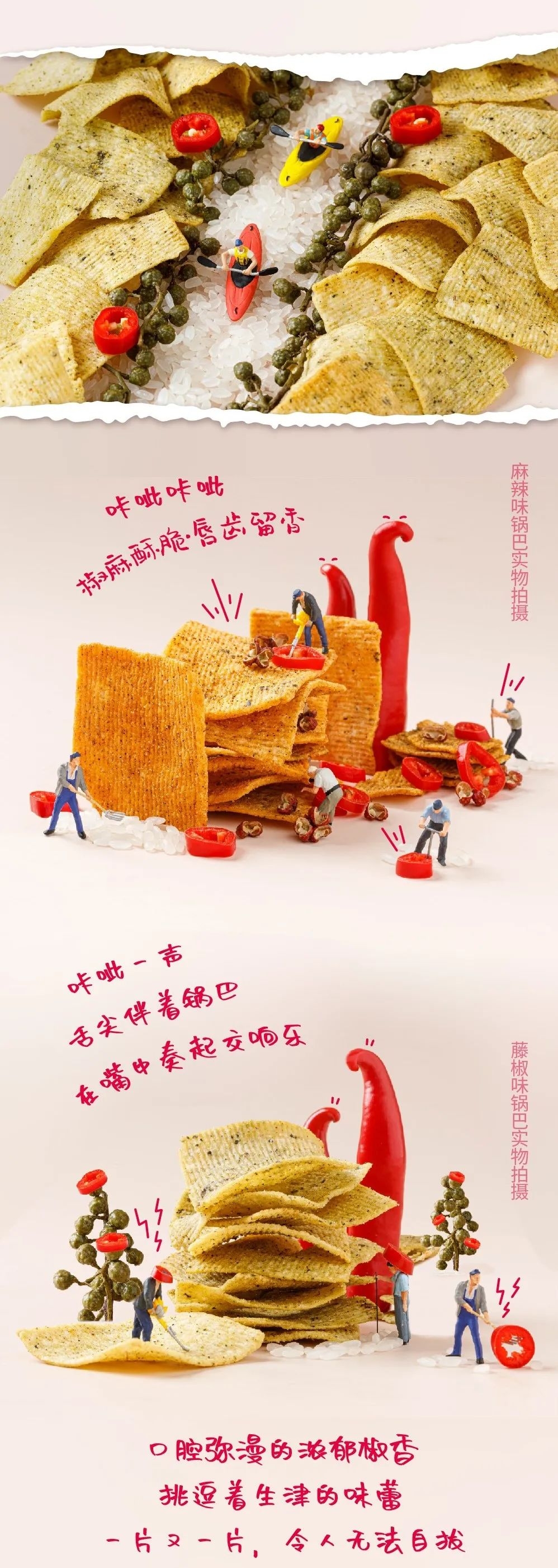 如同打破了次元壁一般,致味覺花椒鍋巴將現(xiàn)實世界饞嘴的我們,與美味的鍋巴世界相連,帶來了刺激的味蕾體驗