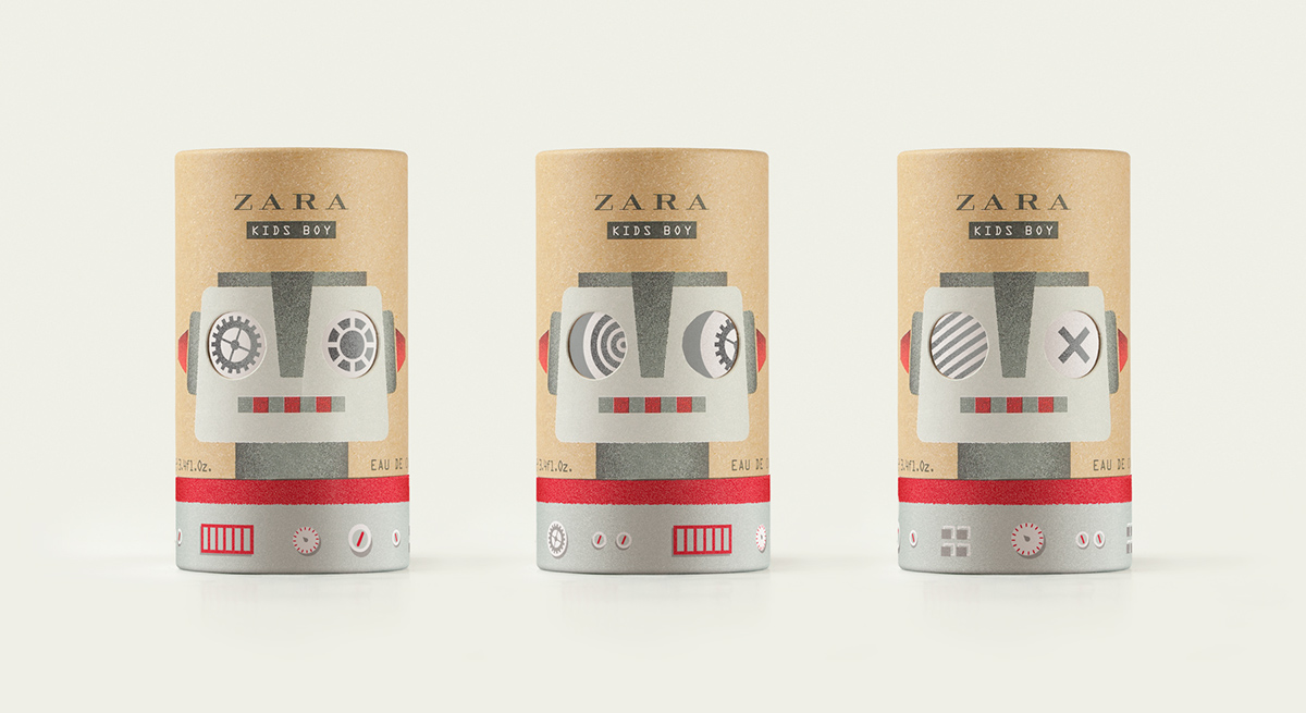 ZARA KIDS是3至14歲的兒童的香水。我們被要求設(shè)計兩個有趣和有吸引力的化妝品包裝,與孩子的視覺語言交談,并且還明確區(qū)分男孩和女孩。 我們設(shè)計了一個兔子和一個機器人精心挑選的調(diào)色板來滿足這些要求。 除了這個解決方案,我們特別感興趣的是給包裝的人物一個俏皮的旋轉(zhuǎn),而不是僅僅是被打開的有吸引力的保護套。 我們想出了這個想法,通過使用紙板管,旋轉(zhuǎn)蓋子,使每個角色的眼睛每轉(zhuǎn)一次。 一個很好的一點點是,蓋子的位置不固定在管子的底部,這意味著每個參考線在銷售點不同。