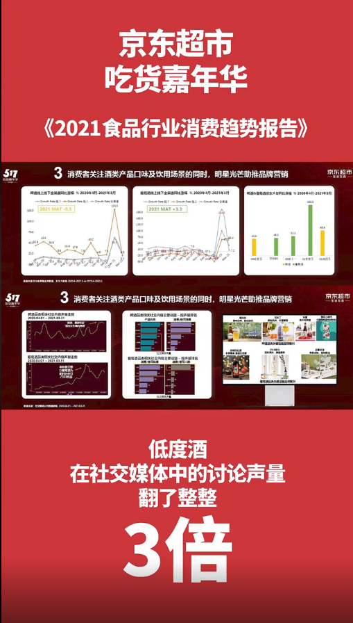 日前,京東超市吃貨嘉年華上發(fā)布的《2021食品行業(yè)消費(fèi)趨勢(shì)報(bào)告》顯示,過(guò)去一年低度酒在社交媒體中的討論聲量翻了整整3倍,消費(fèi)者關(guān)注酒水產(chǎn)品的口味和飲用場(chǎng)景更甚以往。