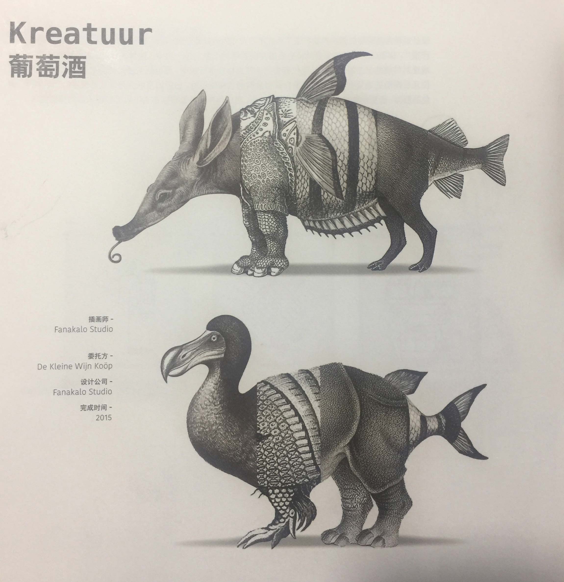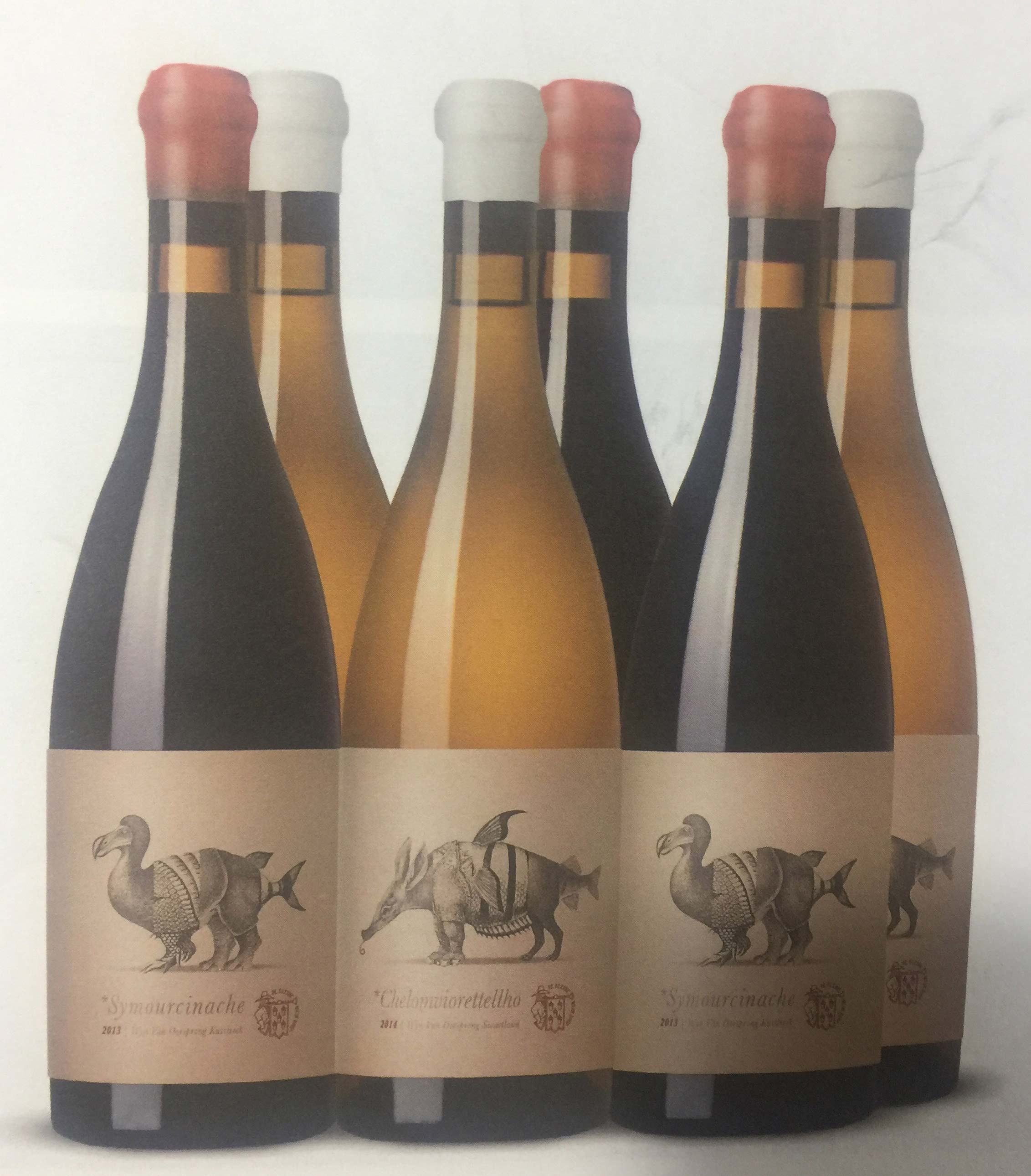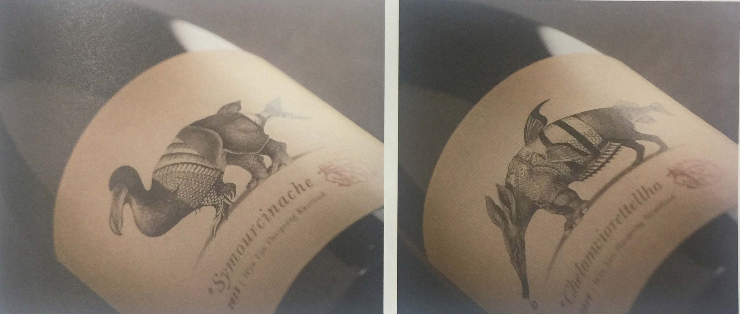 酒瓶標簽是用古老的動物插畫拼貼而成的,由此創(chuàng)造出一個又一個嶄新的動物形象。插畫師將渡渡鳥犰狳、犀牛和魚組合在一起,設(shè)計出一個長著魚尾的四角巨獸。這款葡萄酒由多個葡萄品種混合釀造而成。標簽上動物插畫的數(shù)量與葡萄酒釀造所用的葡萄品種的數(shù)量一致。設(shè)計師隨即利用葡萄品種為這些嶄新的動物形象命名,上文提到的四腳巨獸被命名為Symourcinach。這些動物形象象征著酒瓶與環(huán)境的融合,同時也強調(diào)了這樣一個事實:葡萄酒本身就是一種全新的體驗。
