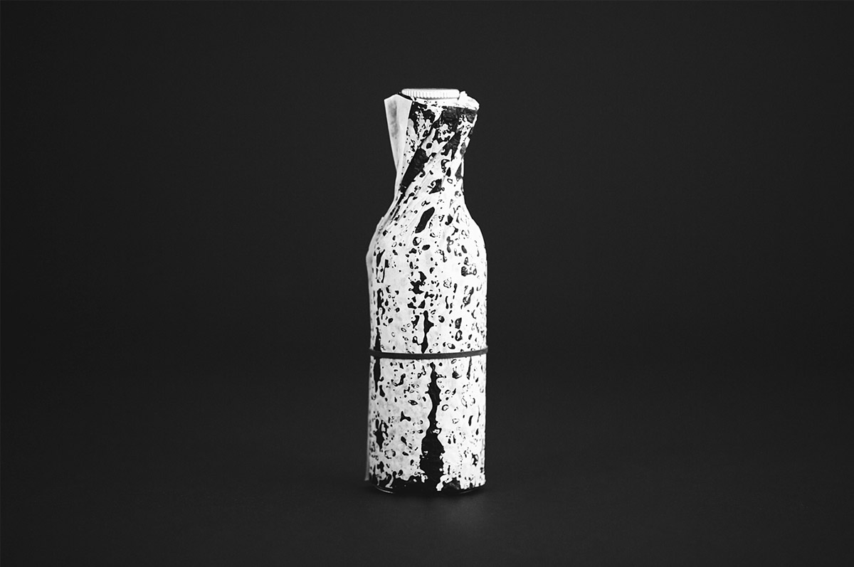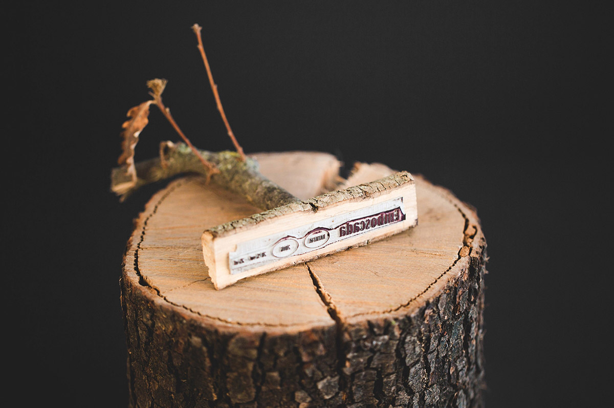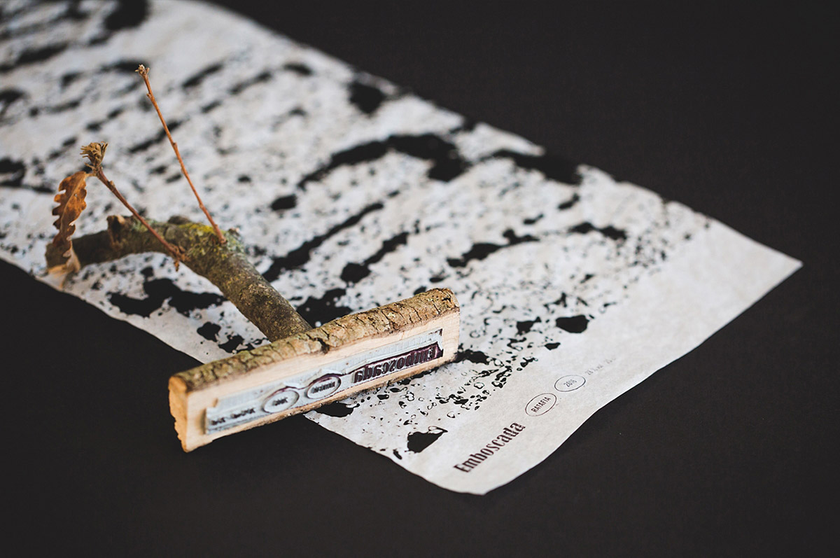 產(chǎn)品的包裝設(shè)計以森林木材為靈感,以創(chuàng)建品牌名稱和包裝圖形圖像。包裝材料是用手工在真絲紙上壓上一個霍姆橡樹皮箱而做成的。這樣,它就變成了覆蓋著瓶子的樹皮層,保護著它珍貴的東西。
