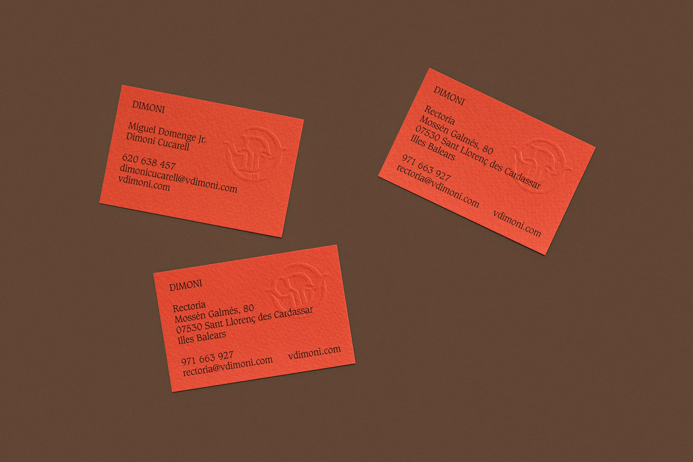 使用Dimoni的“D”和印刷體形狀,我們?cè)O(shè)計(jì)了一個(gè)具有馬略卡的Dimoni特征的字母組合。這個(gè)字母在每張印刷品上都有浮雕。