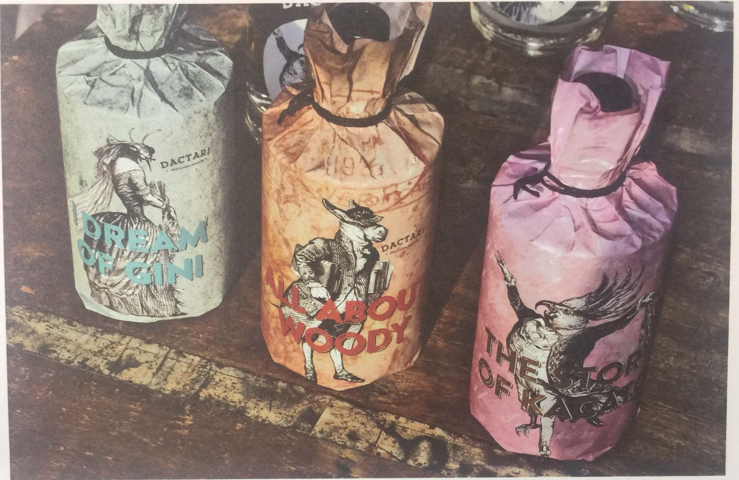 這些賦予人類性格特征的動物插畫是手繪而成的,設(shè)計師對這些19世紀(jì)的插畫進行了重新設(shè)計和著色。每種酒都配有一個特別的動物形象和一則特別的故事。例如,“I dream of Gini”是20世紀(jì)60年代一部風(fēng)靡一時的電視劇名字。Gini象征“瓶中幽靈”,而黃蜂喜歡釀造這種高濃度烈酒所用的葡萄。獨特的手繪人物和彩色的紙質(zhì)包裝將酒瓶包裝成精美的禮品,使酒瓶頗具特色,給人們留下深刻的印象。