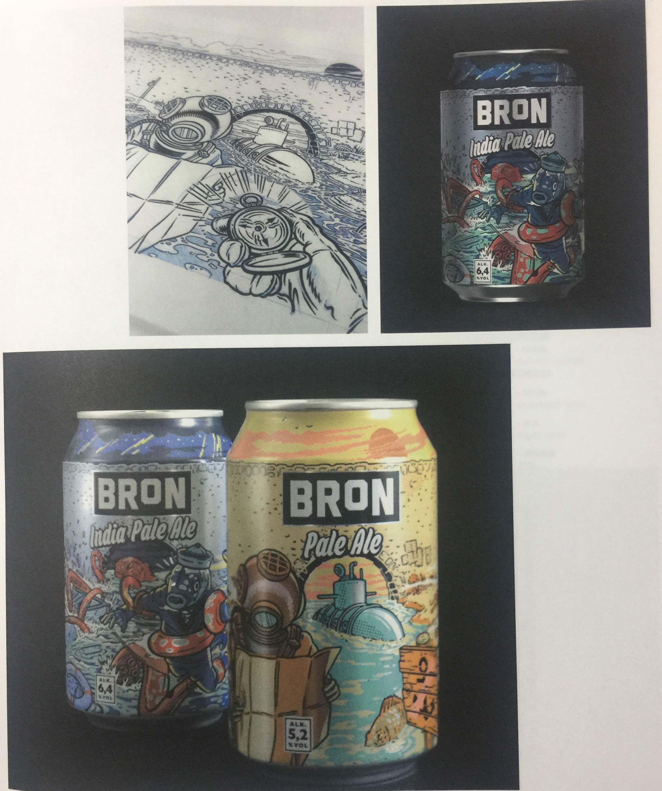 Bron在瑞典語中的意為“橋梁”。該項目的設(shè)計理念圍繞河流和橋梁展開,并將這兩種元素作為淡啤酒和印度式淡啤酒的罐身插畫背景。委托方希望以此向消費者介紹一個不同于其他啤酒產(chǎn)品的啤酒系列。橋下是一個什么都可能發(fā)生的地方,例如漁夫傳說、潛水艇、迷失方向的潛水員和長有巨大觸須的河怪。人們可以一邊喝著罐裝啤酒,一邊瀏覽易拉罐上的故事。為了做到這一點,設(shè)計公司竭盡所能,使插畫看起來更加生動逼真,為消費者呈現(xiàn)一組強有力的、色彩鮮艷的插畫包裝。