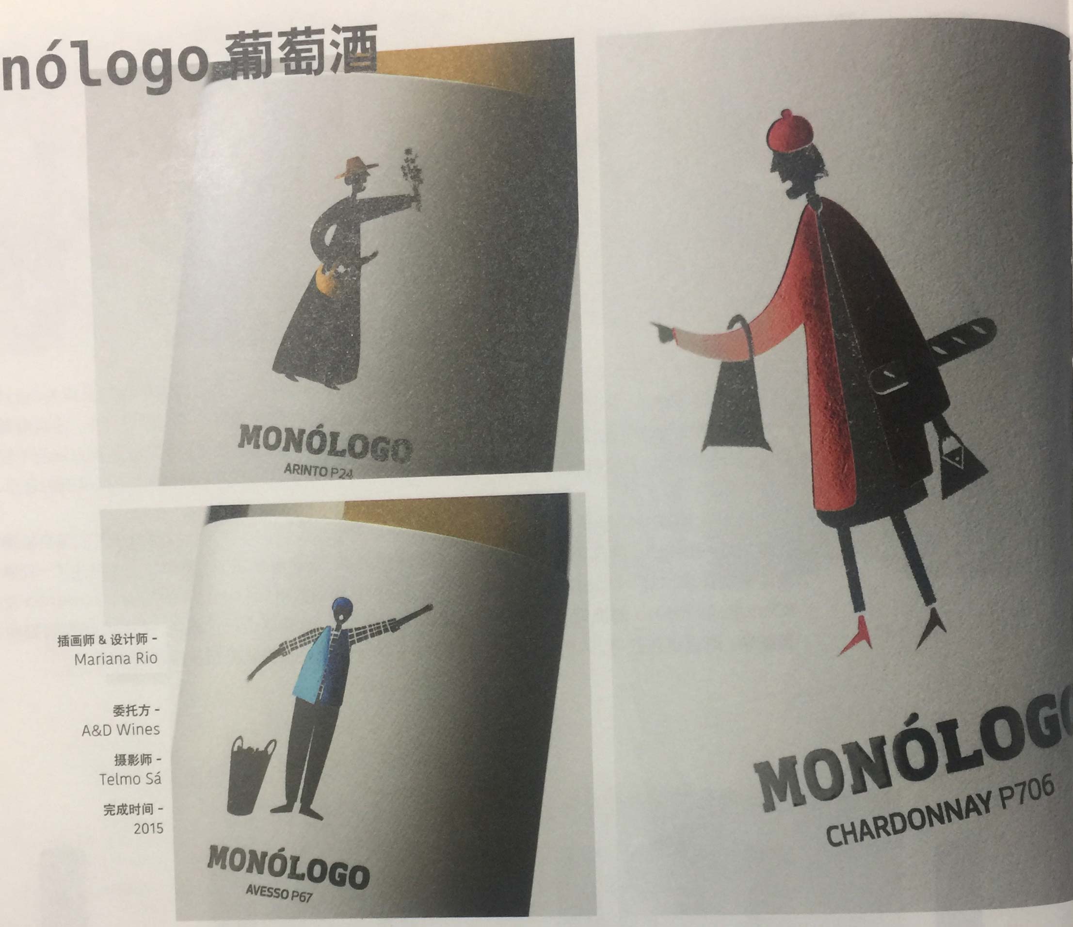 這是一款產(chǎn)自巴揚(yáng)地區(qū)的葡萄牙綠葡萄酒系列產(chǎn)品,之所以選擇將這一系列的產(chǎn)品命名為Monologo,是因?yàn)檫@個詞與戲劇有著緊密的聯(lián)系。每款葡萄酒的瓶身上都繪有一個處在舞臺燈光之下的演員,他們正在向消費(fèi)者介紹一種特別的葡萄品種。例如,Arinto是一種產(chǎn)自葡萄牙巴揚(yáng)地區(qū)的葡萄品種。用這種葡萄釀制的酒,瓶身上繪有一個身著巴揚(yáng)地區(qū)傳統(tǒng)服飾,手持果籃和一束鮮花的婦女形象。Chardonnay是一種原產(chǎn)自法國的葡萄品種,因此,設(shè)計(jì)師為這款葡萄酒設(shè)計(jì)了一個頭戴貝雷帽、胳膊下夾著法棍面包的法國女郎形象。