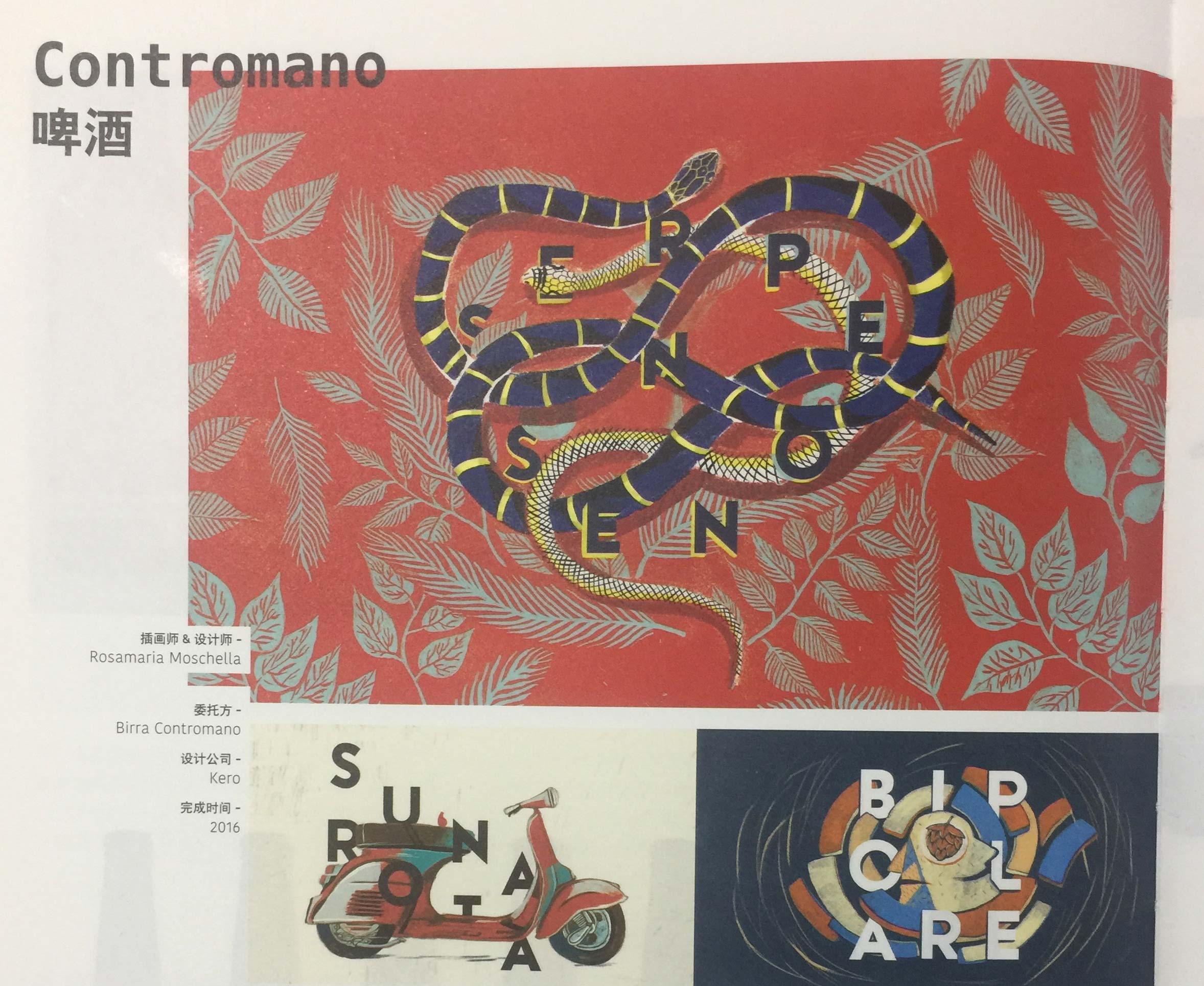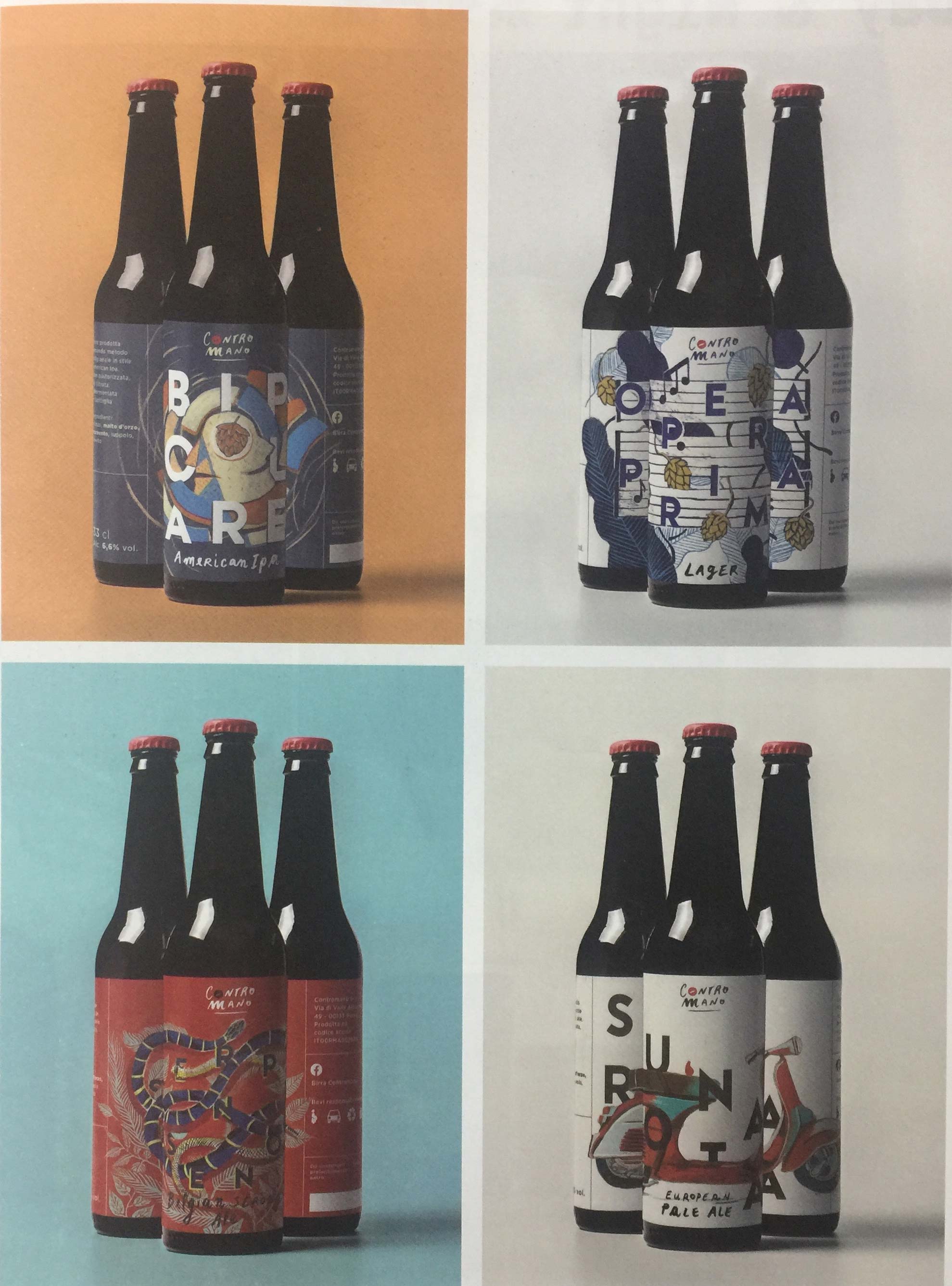 委托方是羅馬一家新建的啤酒廠,希望用一種比喻性的手法對(duì)汽車(chē)或小輪摩托車(chē)占道時(shí)的場(chǎng)景進(jìn)行描繪。瓶標(biāo)上的插畫(huà)體現(xiàn)了啤酒的獨(dú)特名字和味道:美式IPA啤酒、歐洲淡啤酒、牛奶黑啤酒、窖藏啤酒和比利時(shí)烈性啤酒。插畫(huà)師將冷暖色彩搭配起來(lái),并以絲網(wǎng)印制插畫(huà)風(fēng)格和美學(xué)標(biāo)準(zhǔn)為靈感,為消費(fèi)者呈現(xiàn)了一組特別的插畫(huà)包裝。如果你不是意大利人或者不熟悉羅馬的俚語(yǔ),這些名字多半對(duì)你毫無(wú)意義,因?yàn)樗鼈兌嗍桥c啤酒成分有關(guān)的笑話、雙關(guān)語(yǔ)和諧音。