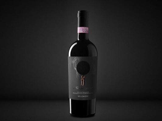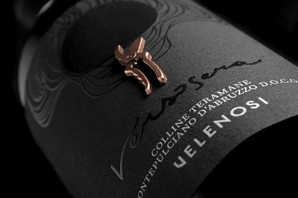標(biāo)簽使用天然棉制成的黑紙代表夜晚,粘在天鵝絨圓圈上,一邊是月亮,另一邊是葡萄酒。同時(shí)選擇天鵝絨的材料,以它的光滑度,暗示除了與黑葡萄的觸覺感覺及其優(yōu)雅感。