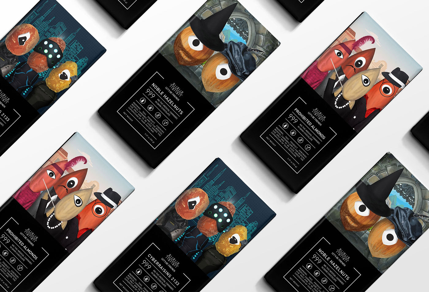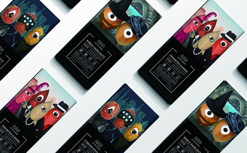 在巧克力的包裝設(shè)計上,設(shè)計師希望消費(fèi)者可以自由地去探索一個新的世界,并在未來的迷幻時代里,與來自大蕪菁的仙女、角獸玩耍,就像憤怒的榛子遇到復(fù)雜的杏仁。