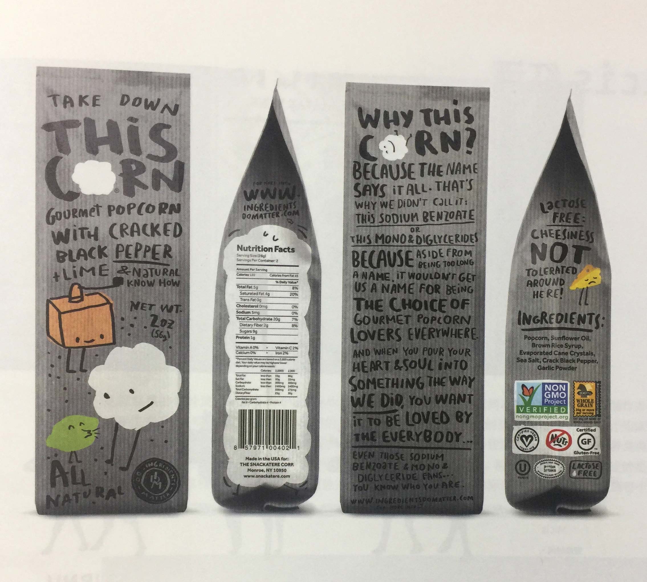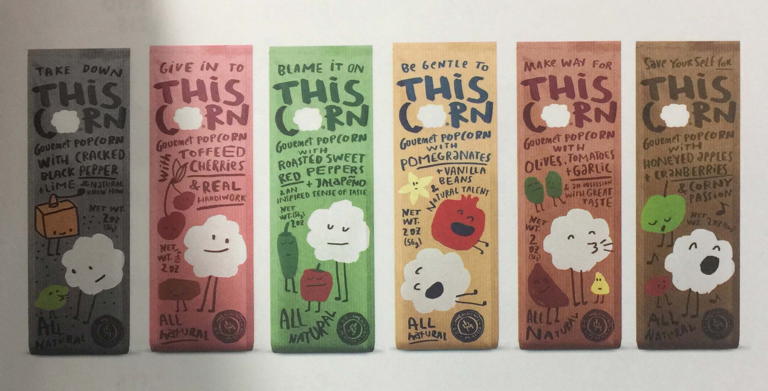 插畫通常只具有裝飾性,無法給人留下深刻印象,而且故事敘述在插畫包裝設(shè)計中只占據(jù)很小的一部分,因此設(shè)計師決定將該項目的設(shè)計重點放在故事敘述上,而這一方式也很好地達到了預期效果。插畫和敘事元素相互協(xié)調(diào)、促進、使這款包裝的設(shè)計更具吸引力。設(shè)計師沒有使用美觀的照片,而是選用了并不常見于食品包裝設(shè)計的人物插畫、斑斕色彩和手寫字體形式,并利用令人難忘的品牌名稱設(shè)計出巧妙詼諧的品牌標識,向消費者傳達出產(chǎn)品原料和口味背后的信息。不同場景下的爆米花和多種人物的手繪插畫不僅賦予產(chǎn)品靈魂,還將歡笑帶給消費者。