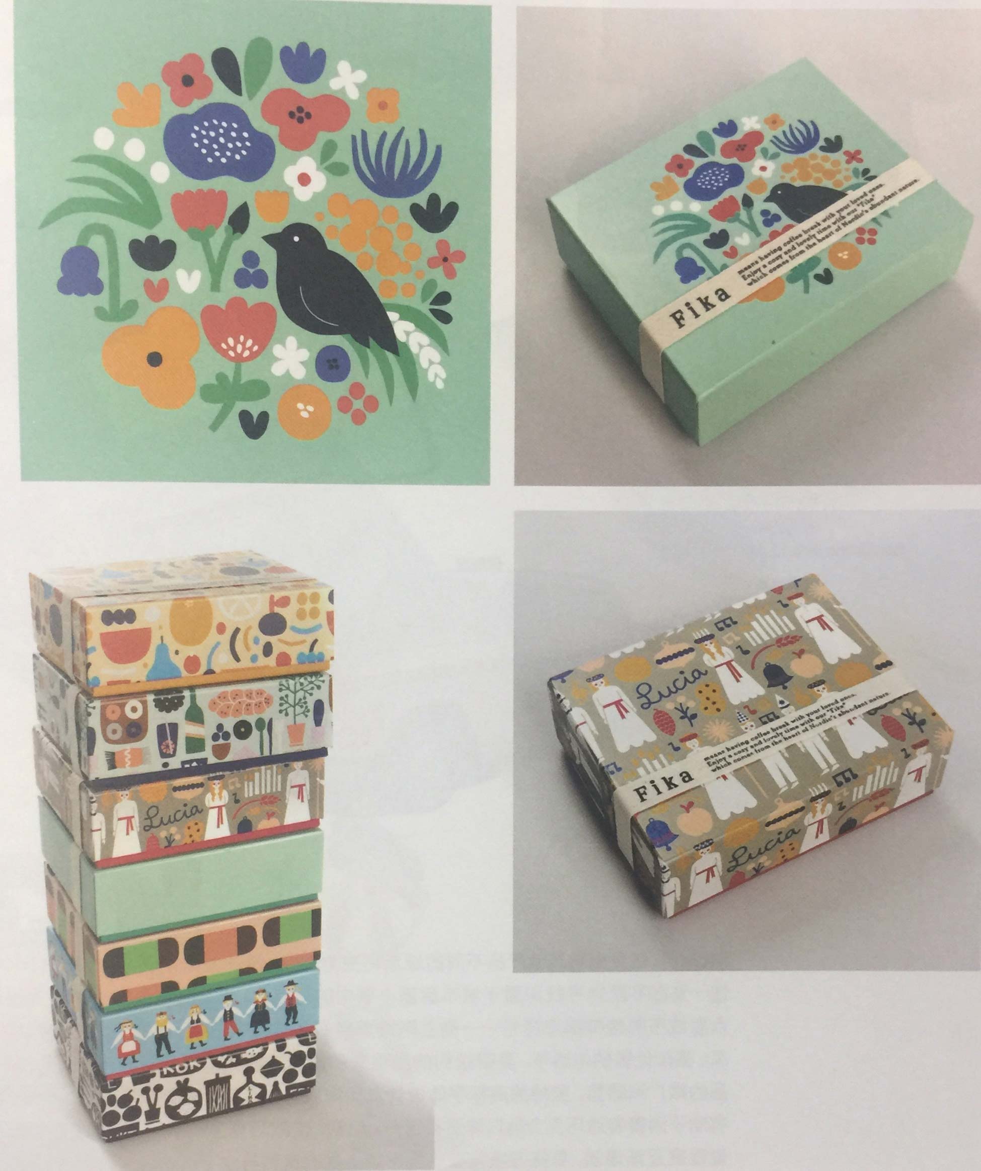 Fika商店位于日本東京的伊勢丹百貨內(nèi)。Fika在瑞典語中意為“咖啡時(shí)間”,它是一家售賣斯堪的納維亞甜品、餅干和糕點(diǎn)的商店。食品包裝上繪有好玩的插畫,可以承裝不同類型的斯堪的納維亞餅干。插畫的主題和色彩是以北歐國家的生活和四季變化為靈感,這也使包裝看起來更具北歐風(fēng)情。