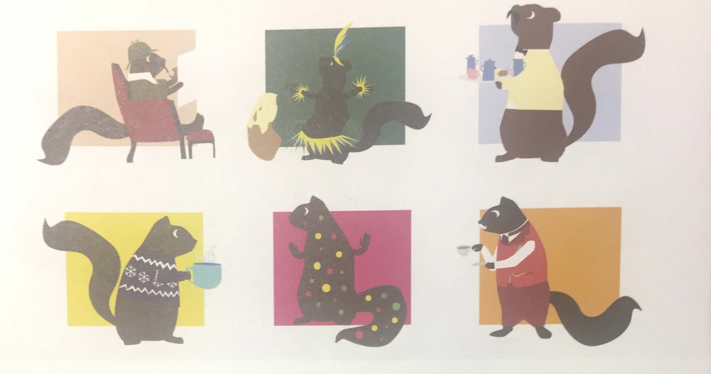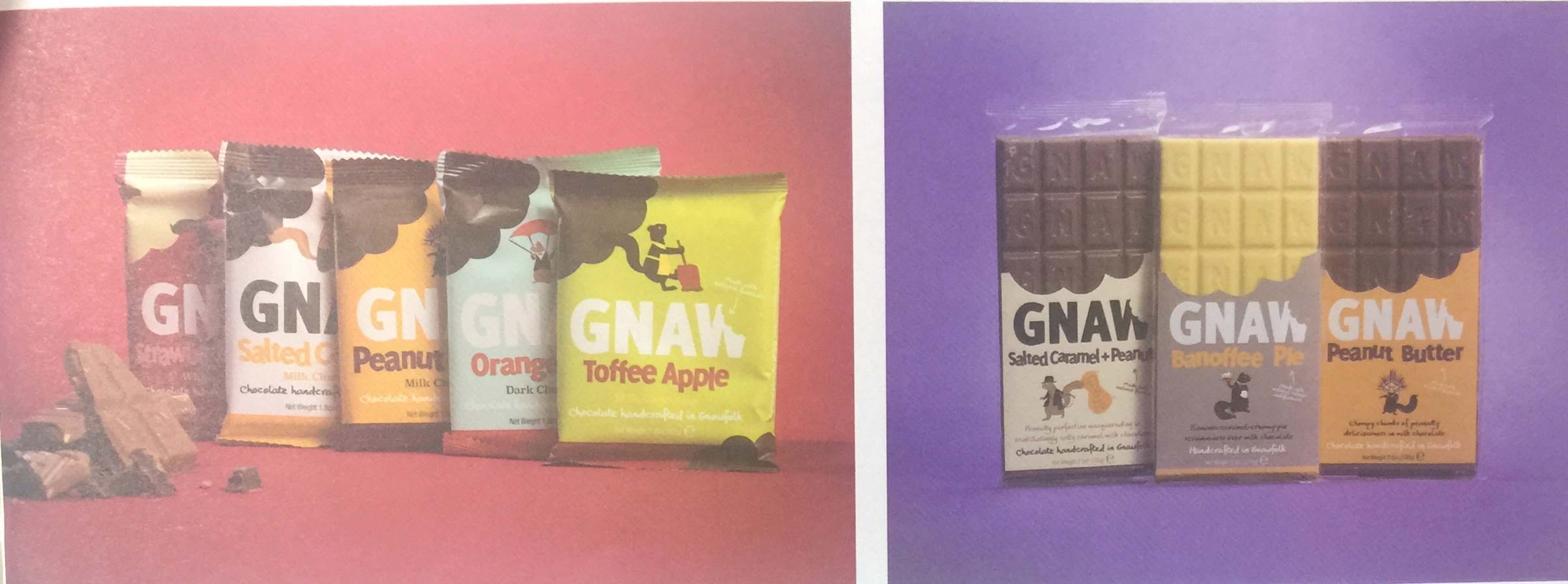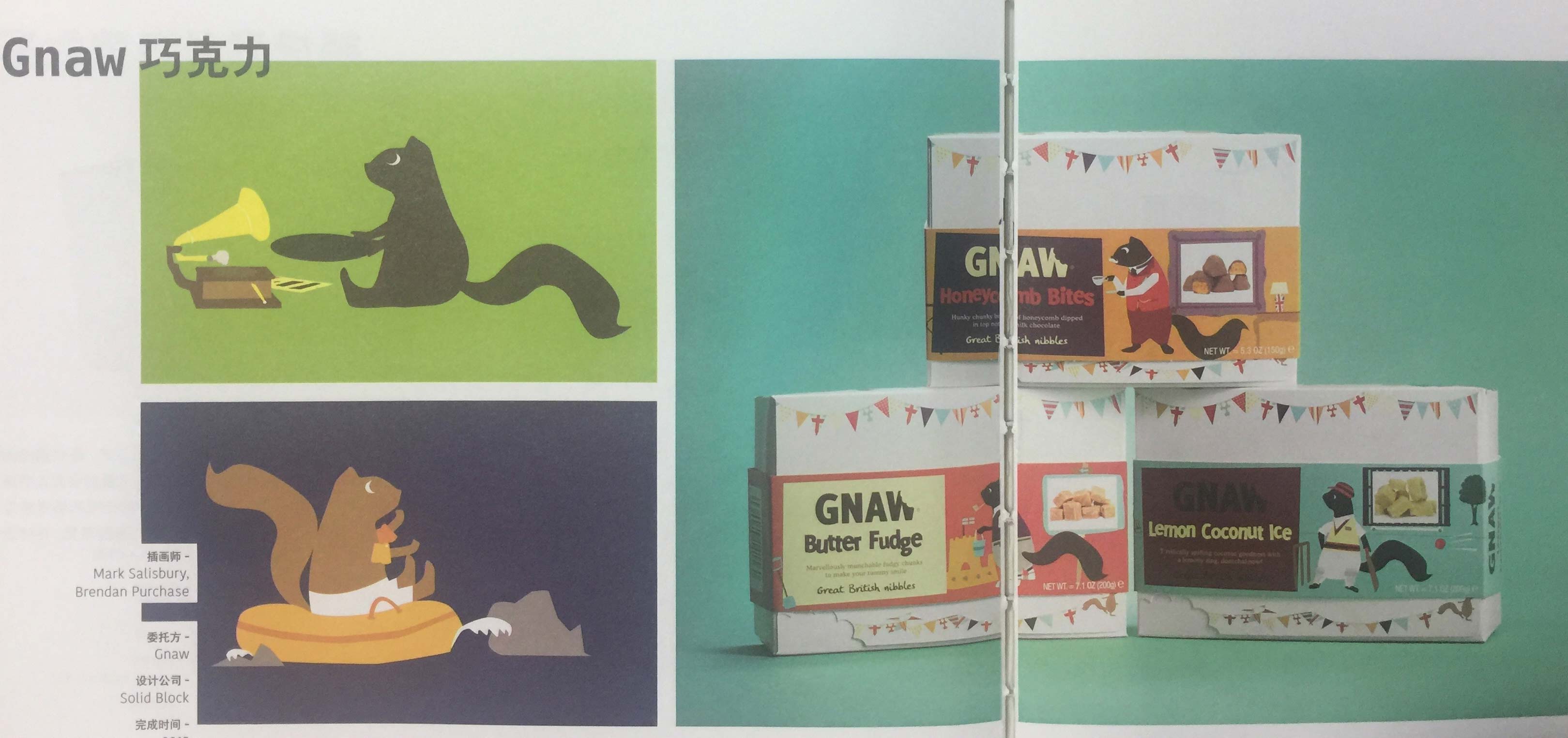 這款包裝的插畫風格受到Matisse(馬蒂斯,法國畫家、雕刻家和版畫家)紙板剪貼畫作品的影響,使用了線條并不完美的大膽平面造型并配以鮮艷的色彩。所有的包裝插畫上均繪有一只松鼠,這一松鼠形象是Gnaw品牌的重要組成部分。委托方認為巧克力應該是一種有趣的零食,而松鼠插畫恰好滿足了這個要求,為非常嚴肅的市場環(huán)境增添了些許趣味。這些松鼠參與了一項與產(chǎn)品或產(chǎn)品名稱有關(guān)的活動。其中的一些關(guān)聯(lián)非常直接,例如香蕉太妃派松鼠裝扮成服務生的模樣,手里拖著一塊香蕉太妃派。藍莓酥松鼠搖身變成了艦隊司令,站在一艘航行于藍莓海洋中的小船上瞭望著海面的情況。
