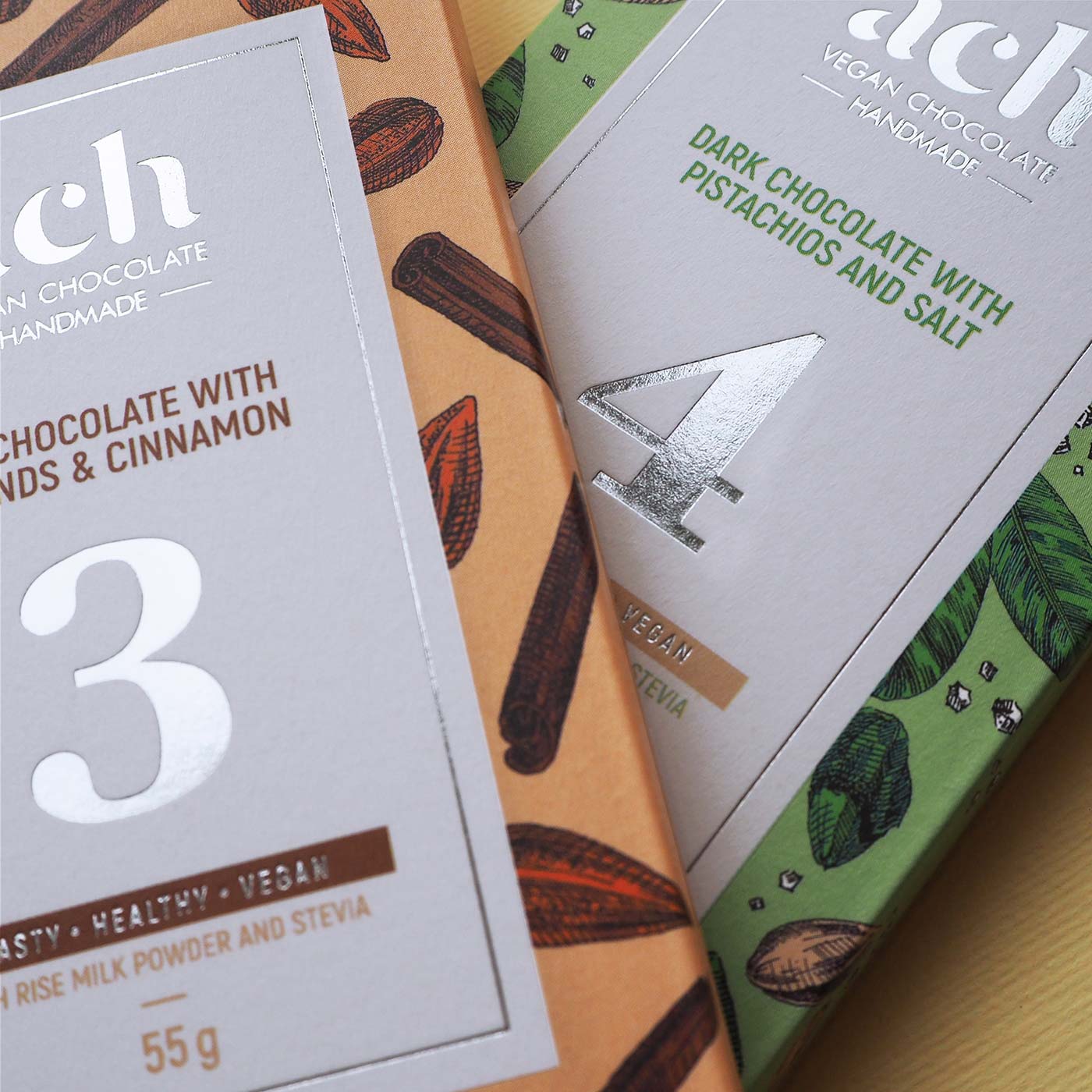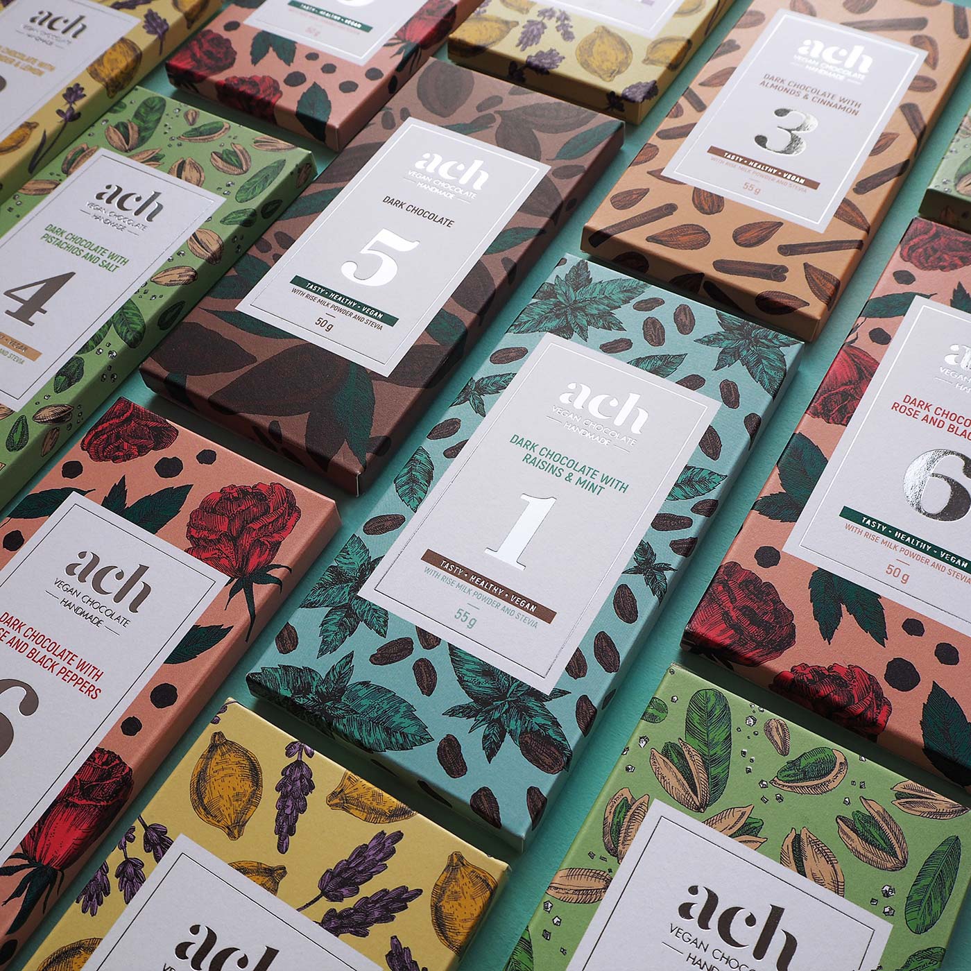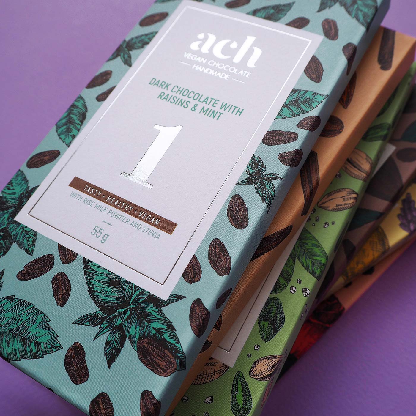 ACH是一個立陶宛的純素食巧克力品牌,它提供了6種不同口味的巧克力。