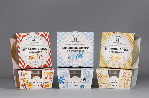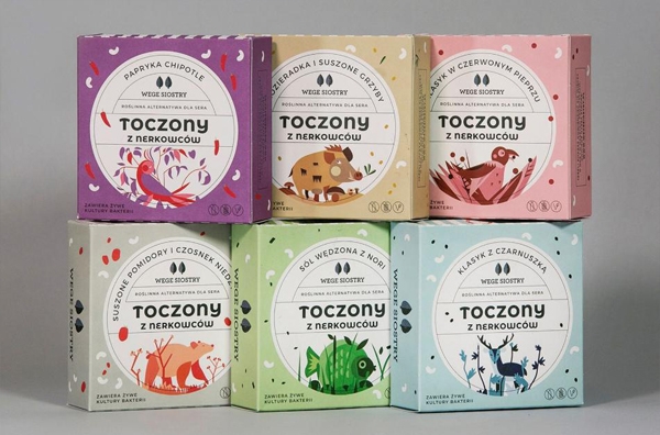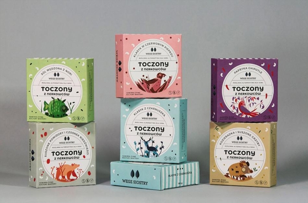 以不同的插畫角色來(lái)表現(xiàn)不同的產(chǎn)品品味相對(duì)應(yīng)的屬性,產(chǎn)品的味道非常豐富,腰果奶酪、腰果奶油和素食主義者“巴馬干酪”。不同的插畫圖形象征產(chǎn)品的素食特征和各種口味,來(lái)幫助客戶找到他們想要的東西。插畫設(shè)計(jì)簡(jiǎn)約清新,色彩豐富,可鹽可甜且制作精良,獨(dú)特的風(fēng)格設(shè)計(jì)與市場(chǎng)上的同類產(chǎn)品形成明顯差異,引起消費(fèi)者的注意。