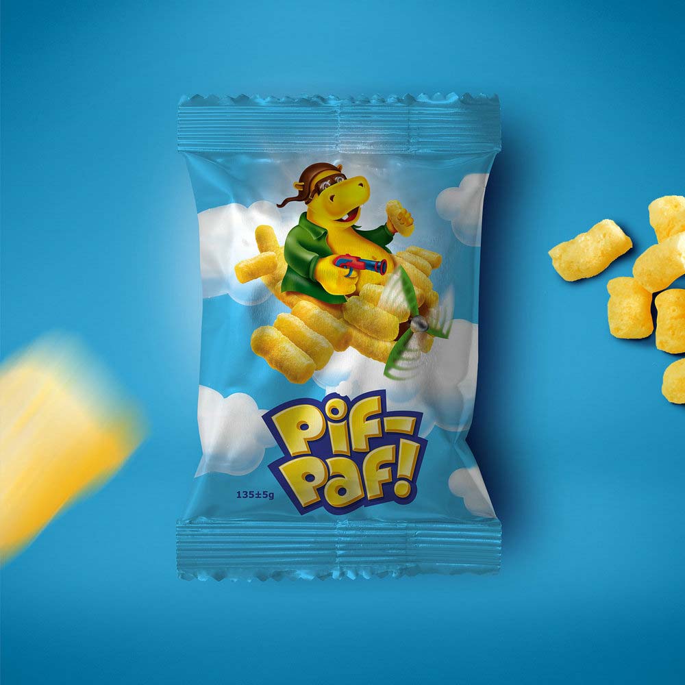 此次的Pif-Paf零食小吃就是由他們生產,在美味,芬芳,解凍的玉米棒撒上糖粉 - 回味無窮,包裝設計放大了品牌名與產品的屬性,通俗易懂。