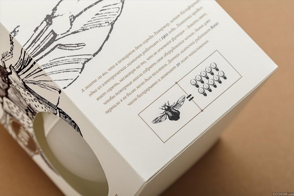其設(shè)計(jì)靈感來源于大發(fā)明家愛迪生。愛迪生認(rèn)為螢火蟲尾部發(fā)出的冷光,是最適合人類的光源。受到這一點(diǎn)的啟發(fā),設(shè)計(jì)師結(jié)合插畫風(fēng)格創(chuàng)造出了獨(dú)具特色燈泡包裝盒。
