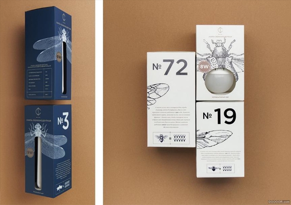 系列包裝由螢火蟲、蜻蜓、蜜蜂等不同的昆蟲將不同瓦數(shù)的燈泡進(jìn)行了分類,并制造出不同形狀的led燈泡代替昆蟲的屁股。這樣的創(chuàng)意不僅十分有趣,引人注意,同時(shí)使人類科技與自然相結(jié)合,傳達(dá)出自然、柔和、健康的產(chǎn)品理念。