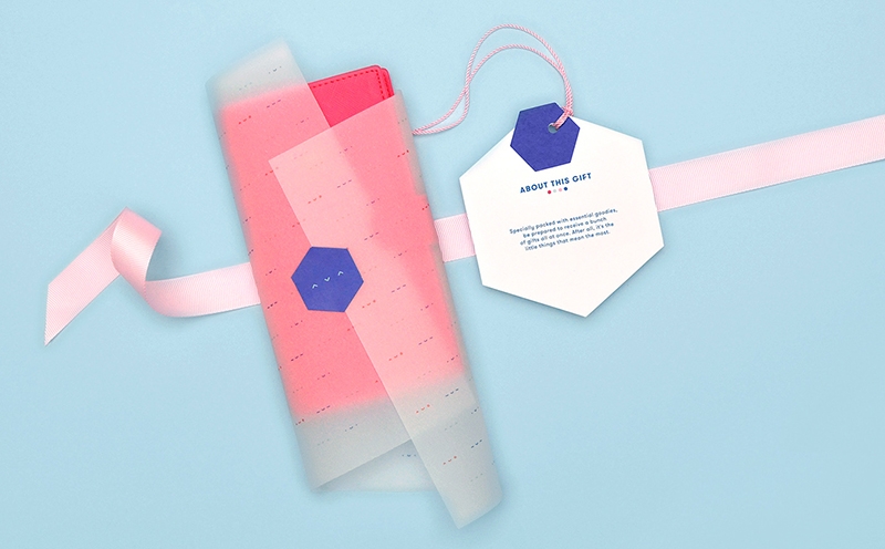 傳統(tǒng)的藍色和粉色被選為品牌包裝的主色調(diào),以此來說明這個品牌既有男性也有女性的禮盒。紅色和淡綠色被添加為對比色,在整個品牌的附屬品中使用。包裝色彩明亮豐富的,傳達著收到禮物時的開心和喜悅。
