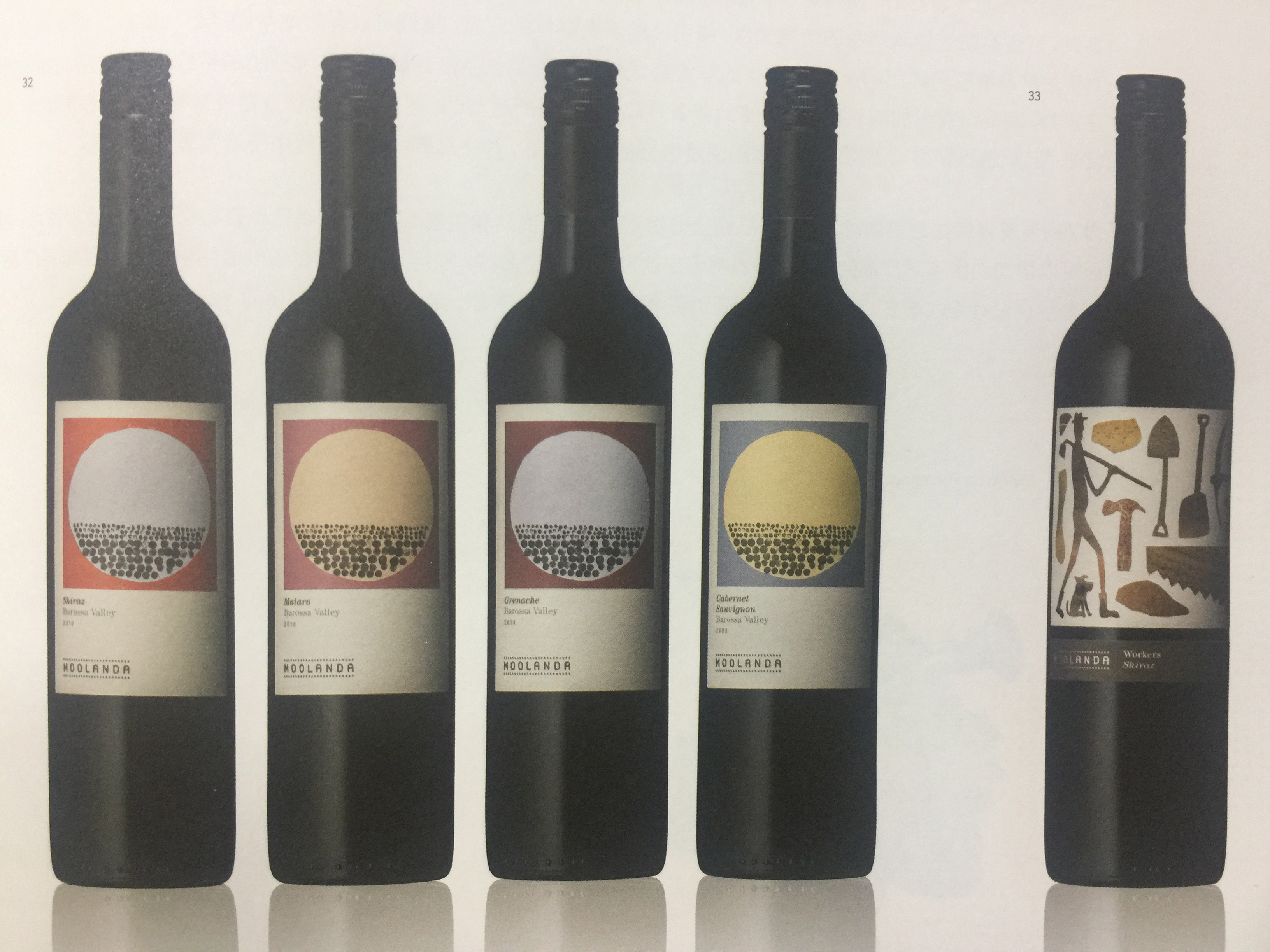 Orlando,一個由Thomson創(chuàng)立的葡萄園的名字。 Orlando在土著語中意為“在另一邊”,因?yàn)槠咸褕@位于巴羅薩谷的“另一邊”。數(shù)千年以來,土著部落一直在這里游蕩,而且了解它的特殊地位。在這片區(qū)域發(fā)現(xiàn)的幾處巖石藝術(shù)遺跡包括一些用紅色、黃色和白色赭石繪制而成的古老畫 作。直至今天,人們還可以在 Yolanda葡萄園找到這類巖石。土壤與這類巖石相互作用影響著葡萄的生長,是 Orlando葡萄生長過程中極其重要的一部分。Morland的品牌推廣和包裝設(shè)計(jì)(圖32)以土壤條件和葡萄園與土著部落的聯(lián)系為靈感。插畫上有很多代表巖石層上方淺層土壤( Yolanda葡萄園的獨(dú)特屬性)的圓點(diǎn)。商標(biāo)被印制在樸素色調(diào)的無涂布紙上,細(xì)節(jié)部分用高光澤清漆進(jìn)行點(diǎn)綴以增加產(chǎn)品的價值。