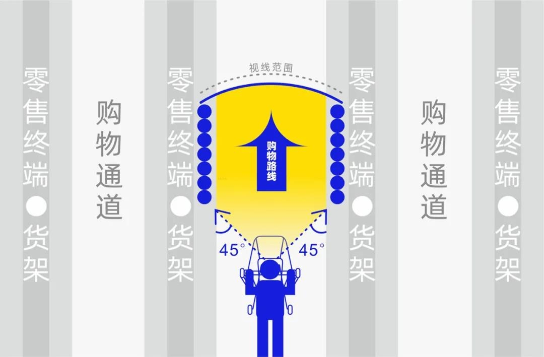 在實(shí)際零售終端,消費(fèi)者推著購物車在購物同道行走的過程,視野會伴隨步伐自然地看向前方左右兩側(cè)的商品陳列貨架,此時(shí)呈45°的區(qū)域就是消費(fèi)者動(dòng)態(tài)的最佳視野范圍,是否在這個(gè)視野范圍內(nèi)吸引到消費(fèi)者是產(chǎn)品獲得優(yōu)先被選擇的關(guān)鍵一步。