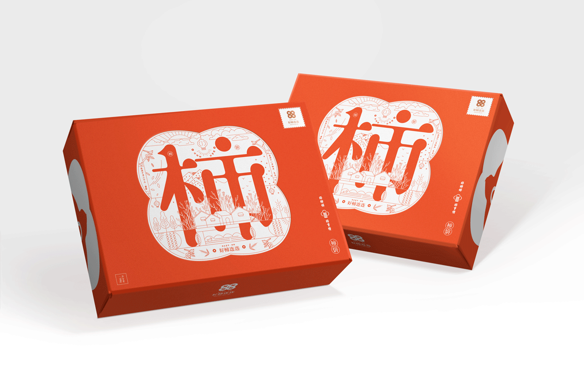為了保證純正天然的視覺感受,包裝整體以柿子天然色作為主體色,在其正面,以柿子的剪影作為整個包裝的視覺中心,圍繞其我們創(chuàng)作了優(yōu)美線條感的圖形,描述了柿餅形成的兩大節(jié)氣過程-霜降和冬至,簡潔的線條概括了好柿餅的升華過程,在畫面的最中心是富平生態(tài)農(nóng)家田園風的生態(tài)景觀,底部是富平石川河的描述,簡潔凝練的線條,營造出了富有詩意的品牌氣質,同時講述了好柿連連的品牌故事。