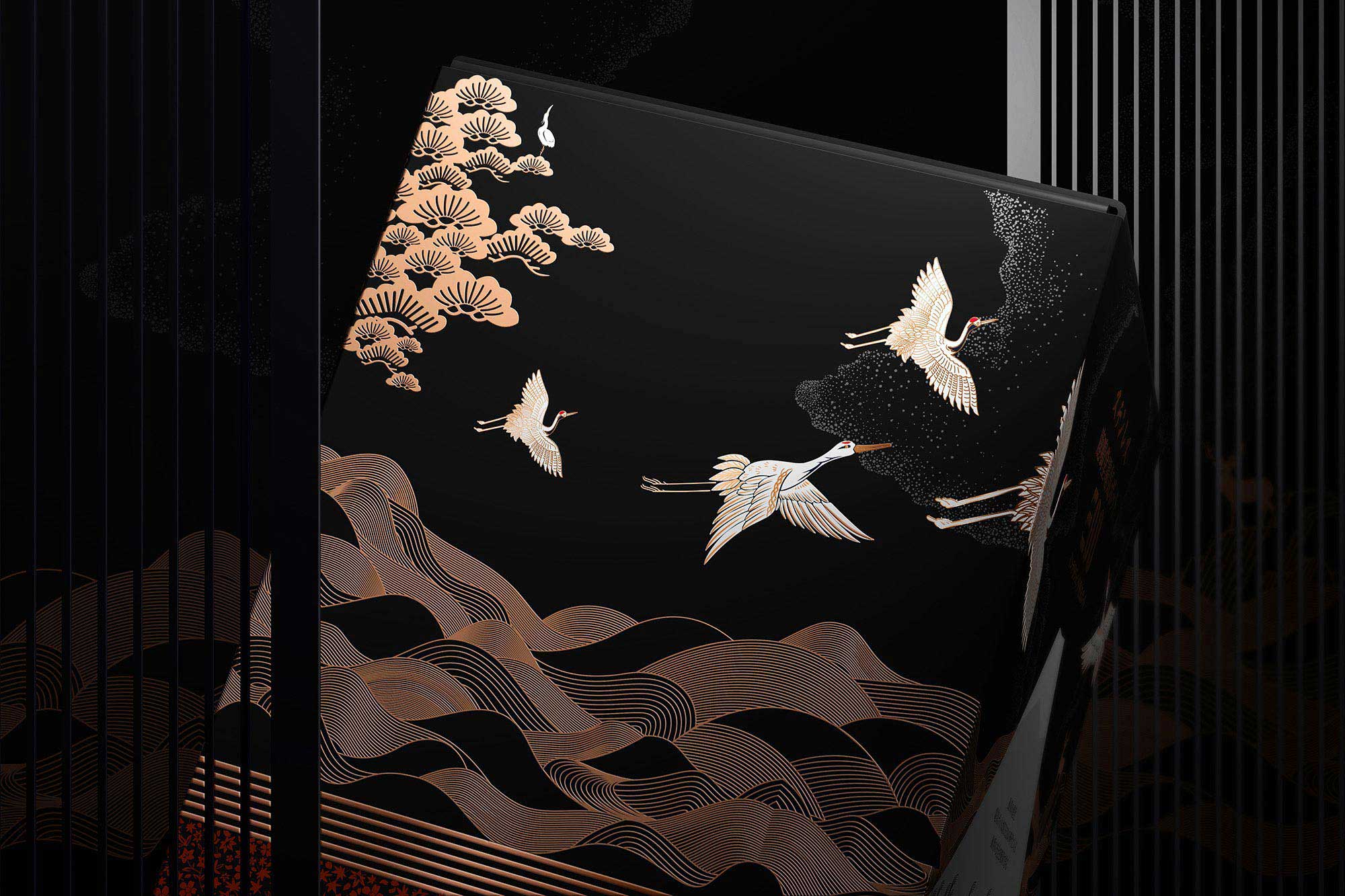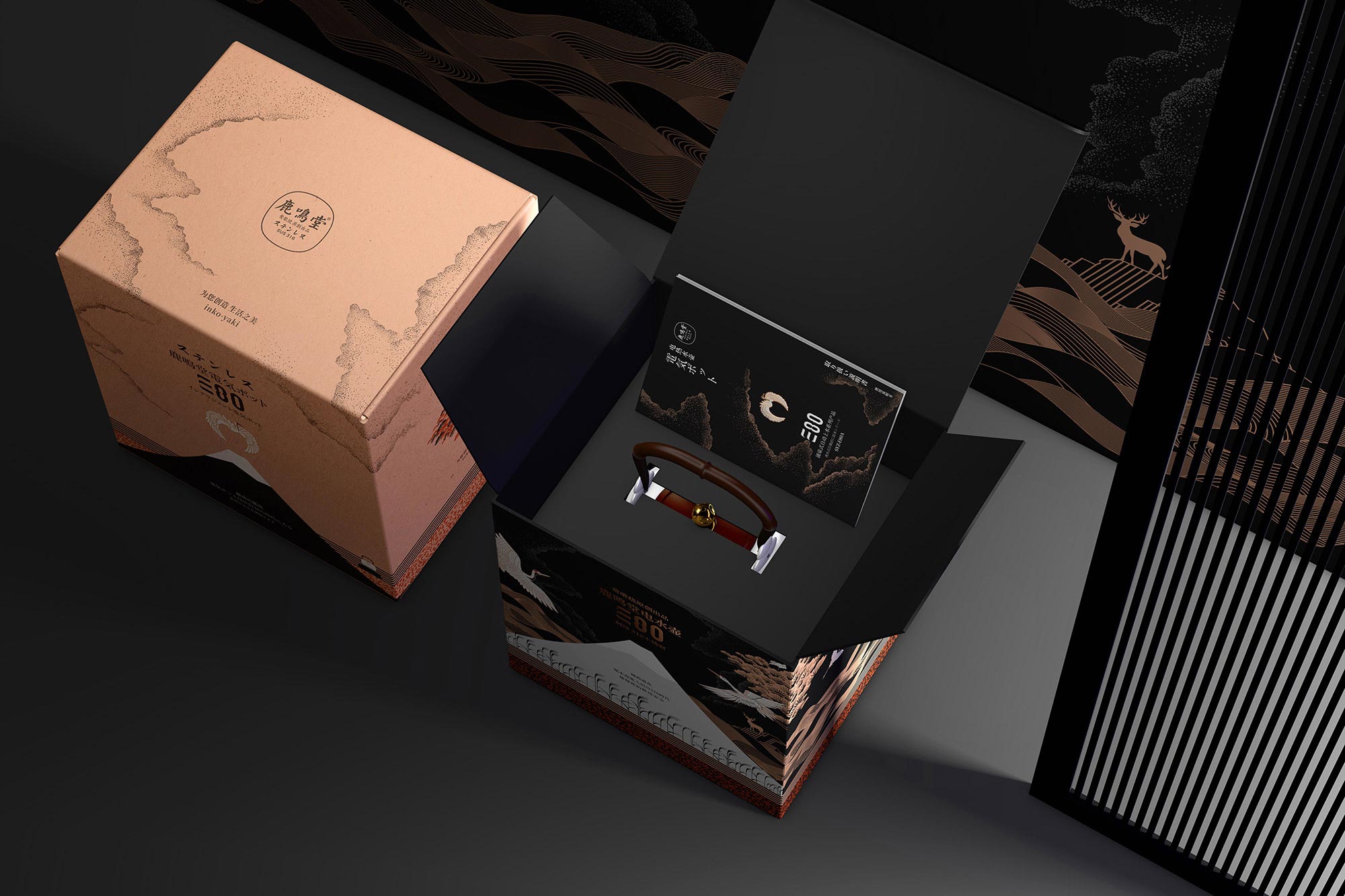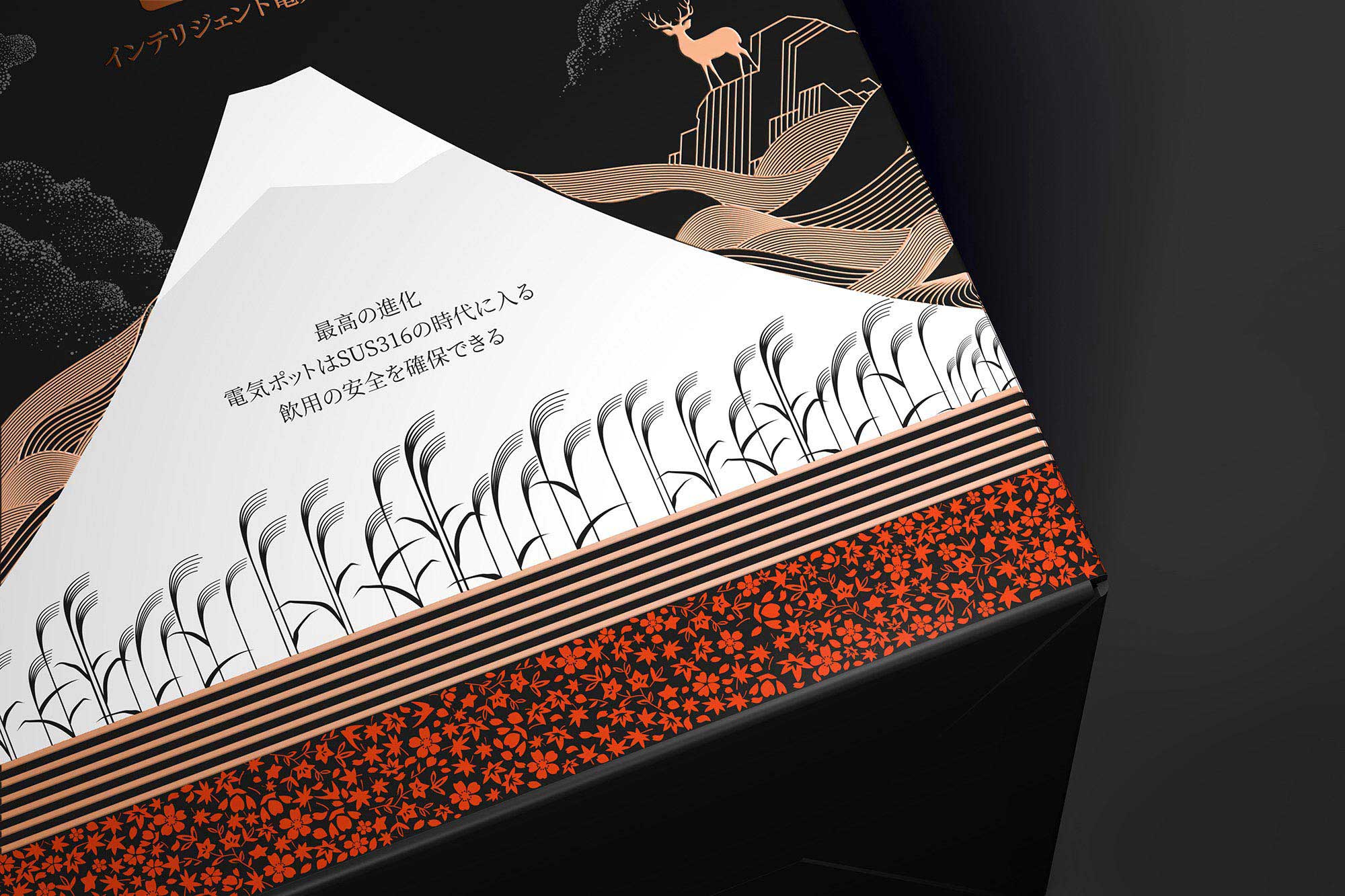 結(jié)合產(chǎn)品自身特性,包裝我們采用高級(jí)特種珠光紙作為外盒包材,整體盒型選用與產(chǎn)品契合度高的方形,并根據(jù)產(chǎn)品的結(jié)構(gòu)特性,采用多層內(nèi)襯,和卡扣以確保包裝盒體的緩沖性能和穩(wěn)定性,并在內(nèi)襯配色上與茶壺的雙色對(duì)應(yīng),以達(dá)到視覺上的關(guān)聯(lián)呼應(yīng),營造統(tǒng)一的視覺美學(xué)。整體包裝風(fēng)格契合產(chǎn)品的日式東方美學(xué)定位,營造禪意文化氣質(zhì),配以日本京都二條城低調(diào)的黑色,華貴的金色,以體現(xiàn)產(chǎn)品的神秘高貴品質(zhì),并利用印刷工藝模擬和營造日式傳統(tǒng)的漆器,蒔繪風(fēng)格的技藝,實(shí)現(xiàn)產(chǎn)品包裝風(fēng)格的重塑。