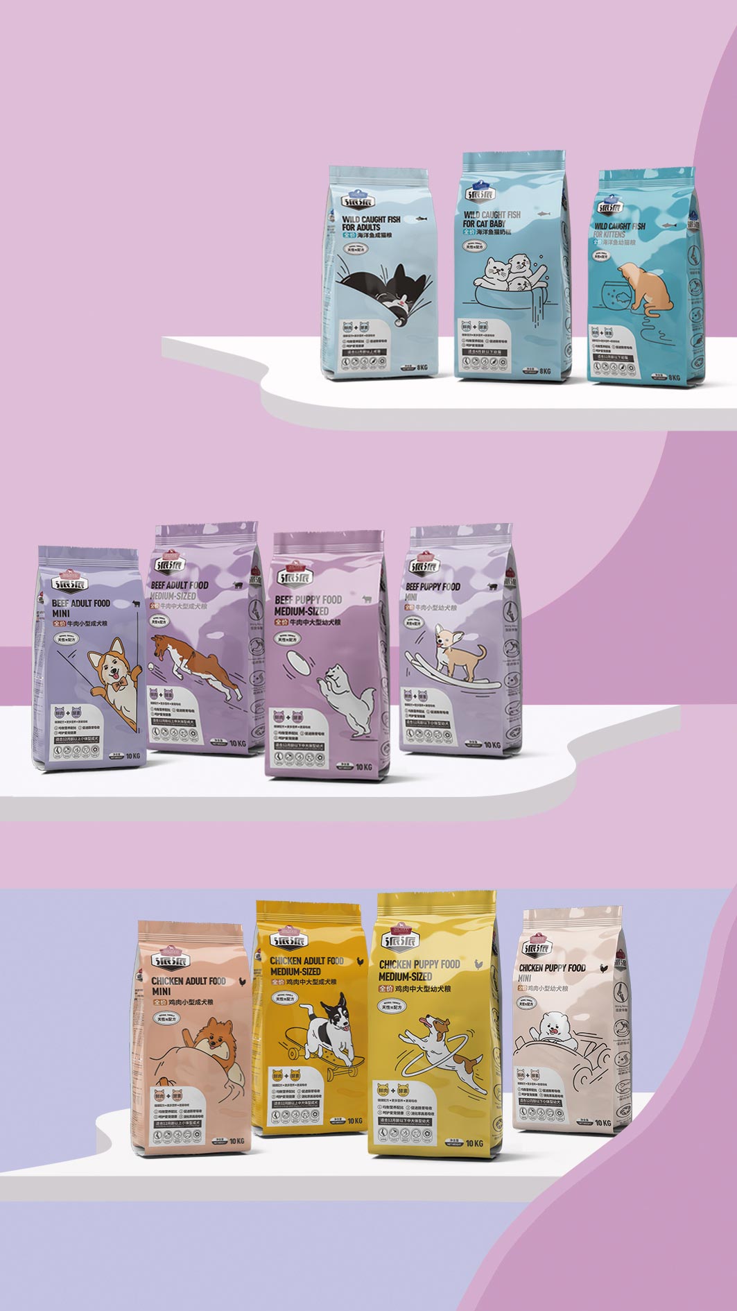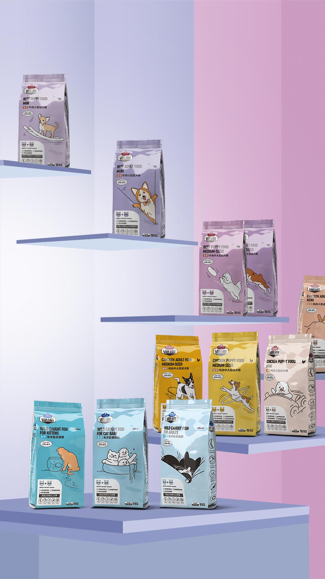針對這一目標問題,我們從產(chǎn)品的實際消費人群年輕寵物主人的角度出發(fā),設(shè)計了簡約,活潑,有情景感的插畫寵物形象,通過寵物主人與寵物之間最熟悉的日常游戲活動來呈現(xiàn)不同場景,以此和寵物主人即寵物食品消費者建立情感溝通,達到情景交融的目的,塑造品牌美好的第一印象。