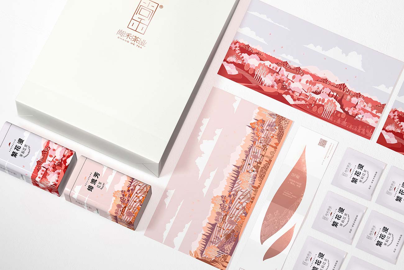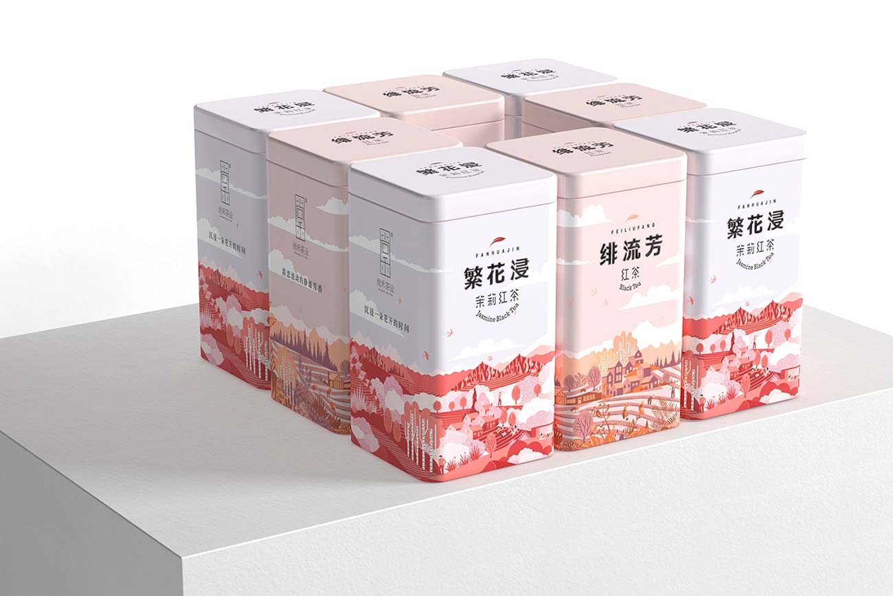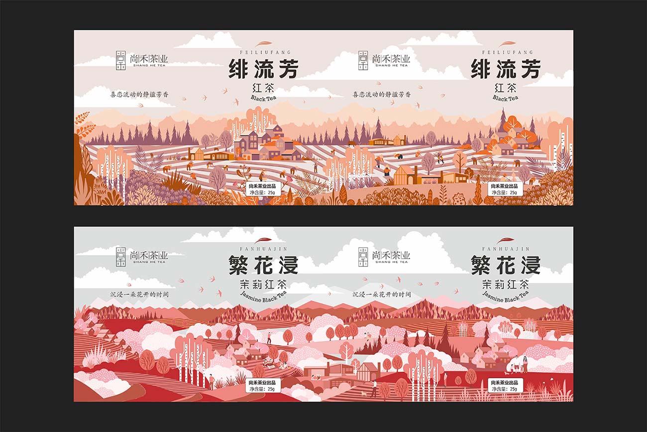 產(chǎn)品包裝,以精致馬口鐵盒作為包材,以高低兩種盒型區(qū)分普通款和高端款。為了更好地還原和展現(xiàn)尚禾茶業(yè)在制茶上的極致態(tài)度和手工工藝品質(zhì),我們采用了插畫的表現(xiàn)風(fēng)格,根據(jù)紅茶,茉莉紅茶創(chuàng)作了系列化的主題場(chǎng)景插畫,將田園,茶園,山水,地理風(fēng)貌,人文景觀融入其中,描述茶的自然屬性,整體色調(diào)以不同明度的紅色區(qū)分紅茶和茉莉紅茶,相統(tǒng)一又有區(qū)分。