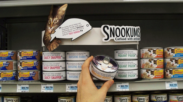 Snookums是一種貓的食物,適合那些膽大妄為的貓;那些粗魯、強(qiáng)硬、受夠了你的粗心大意和令人尷尬的人類行為的貓。其目的是用一種獨特的“無糖衣”貓的形象來區(qū)分斯努庫姆品牌和競爭對手,引導(dǎo)全世界貓所感受到的挫折感以及他們?nèi)祟愔魅说淖飷焊泻腿毕?。這個品牌也必須在視覺上與眾不同,而且這么做,因為它的簡單和“不胡扯”的外觀和感覺模仿了斯努庫姆貓對消費(fèi)者的態(tài)度。