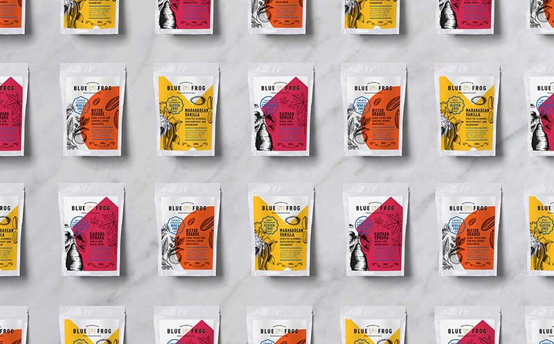BLUEFROG?早餐燕麥?zhǔn)沁@次包裝項目的主角,我們首先創(chuàng)造引人注目的品牌標(biāo)識,其中,太陽代表早上,勺子代表吃早飯,兩片樹葉代表品牌天然健康的理念。視覺系統(tǒng)設(shè)計上的挑戰(zhàn)是創(chuàng)造大膽,藝術(shù)和紋理化的包裝設(shè)計,以暗示大膽的口味和品牌陳述。我們設(shè)計鮮艷的顏色以刺激人的食欲,三種顏色分別代表三種口味,植物插畫的設(shè)計是根據(jù)口味的不同而變化的,同時也表達了品牌健康天然的產(chǎn)品品質(zhì)。文字的排版和印章則為包裝增添了意思藝術(shù)感。