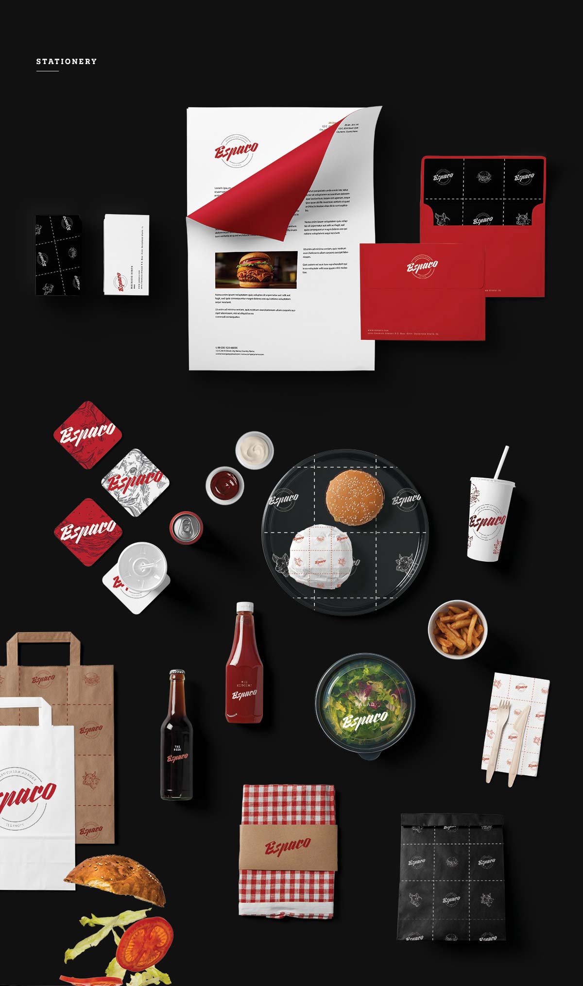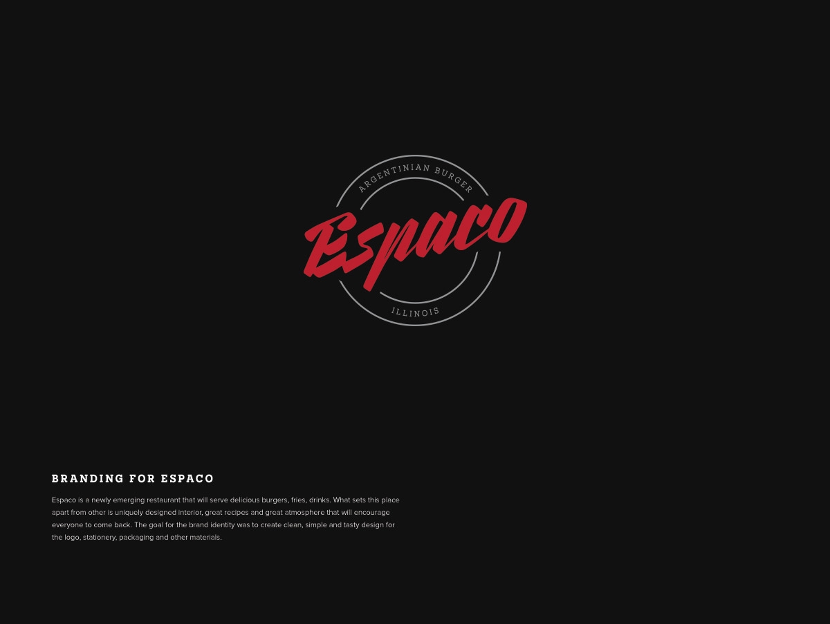 Espaco是一家新開的餐廳,供應美味的漢堡、薯條和飲料。與其他地方不同的是,它獨特的內(nèi)部設計,偉大的食譜和偉大的氛圍,鼓勵每個人都可以經(jīng)常來這個地方用餐。品牌標識的目標是用標志、文具、包裝和其他材料創(chuàng)造干凈、簡單、美味的設計。
