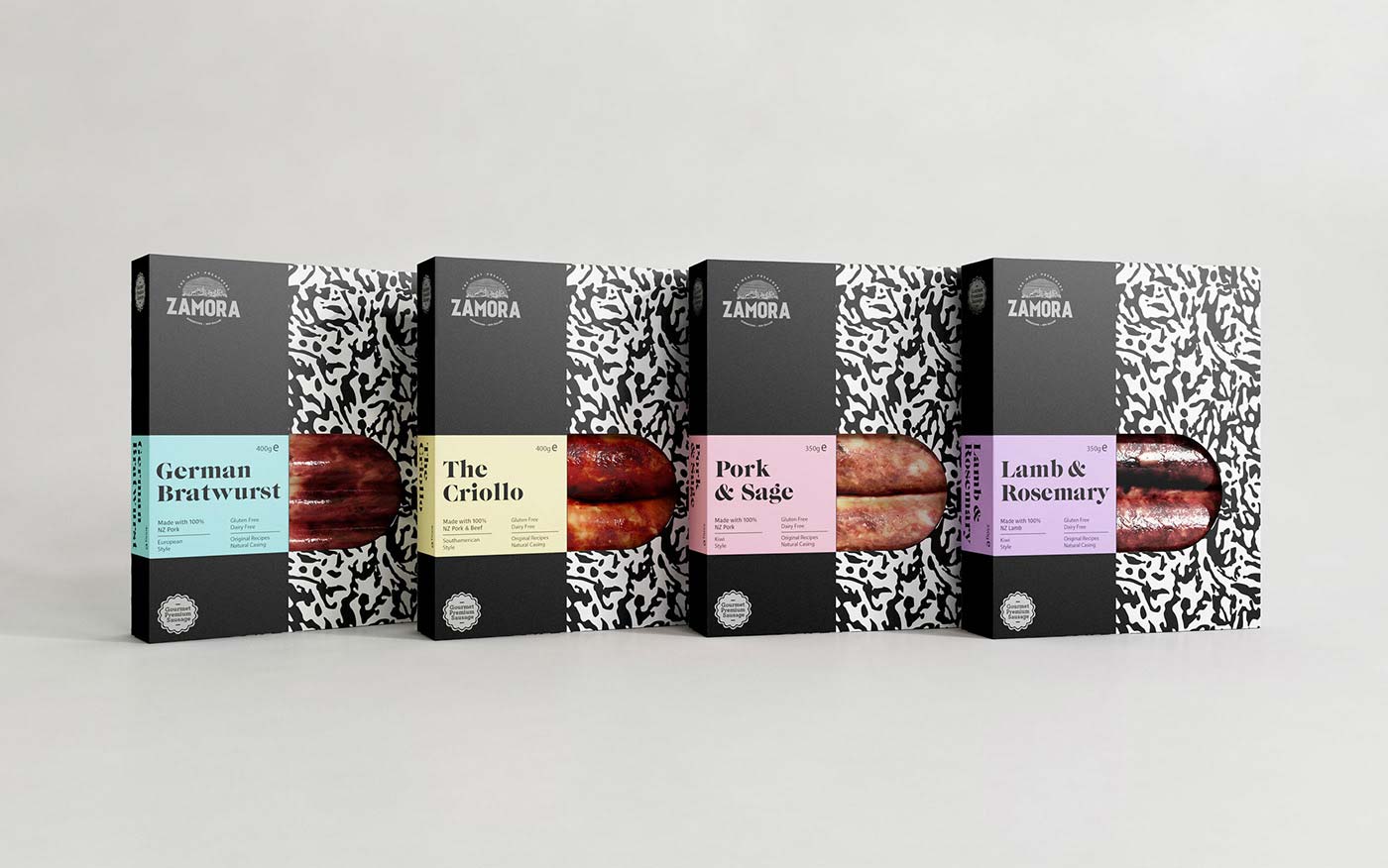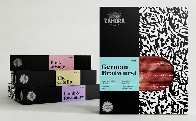 為了實(shí)現(xiàn)這一戰(zhàn)略,設(shè)計(jì)方法圍繞著圖形執(zhí)行的獨(dú)特性和大膽性展開(kāi)。有一個(gè)優(yōu)雅的和視覺(jué)的戲劇圍繞香腸系列,完全符合扎莫拉的品牌價(jià)值觀(guān)。