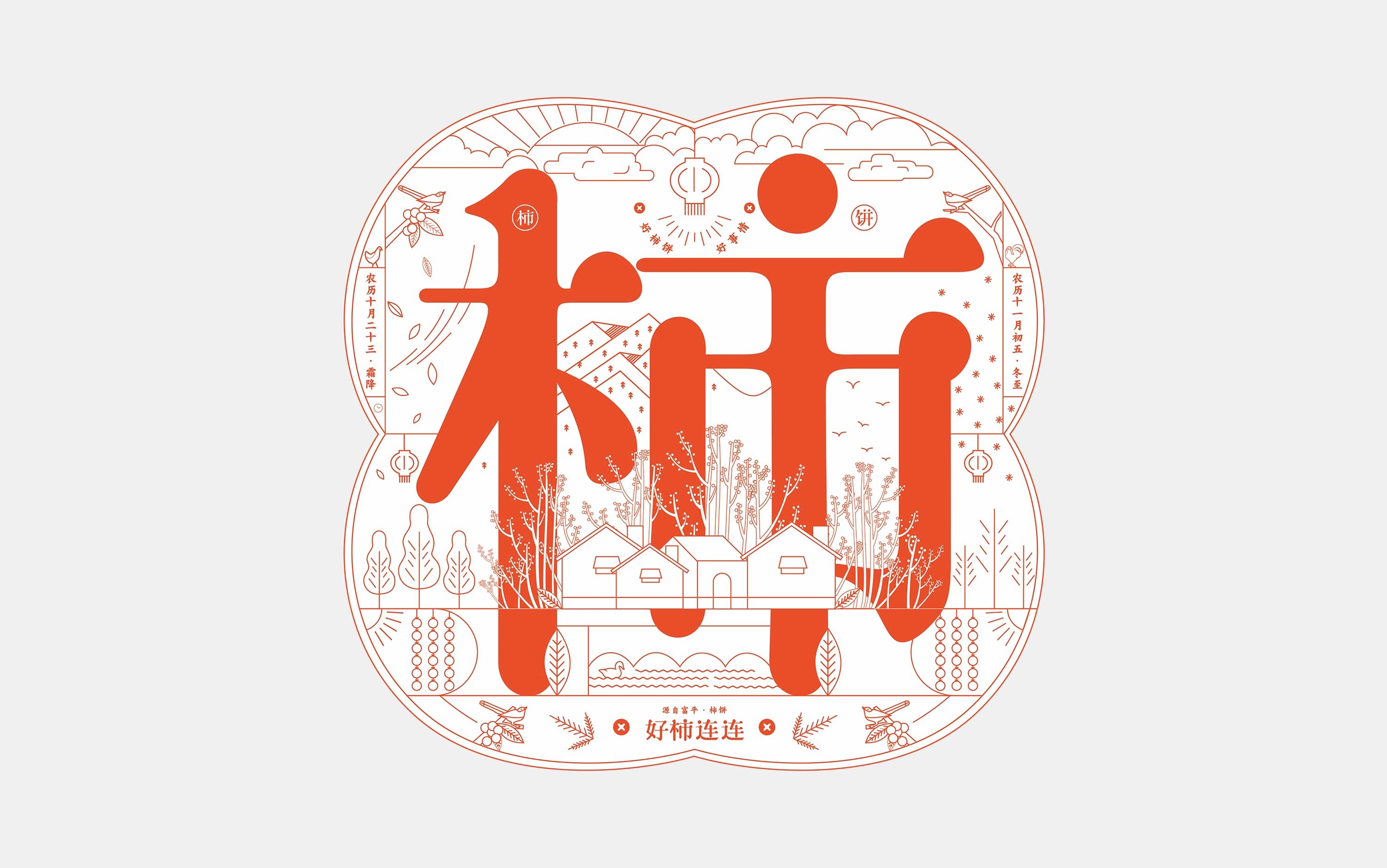 在設計上,包裝以柿子的剪影符號作為整個包裝的視覺中心,圍繞柿這個字體,穿插融入優(yōu)美線條構成的場景插圖,它描述了柿餅形成的兩大節(jié)氣過程-霜降和冬至。