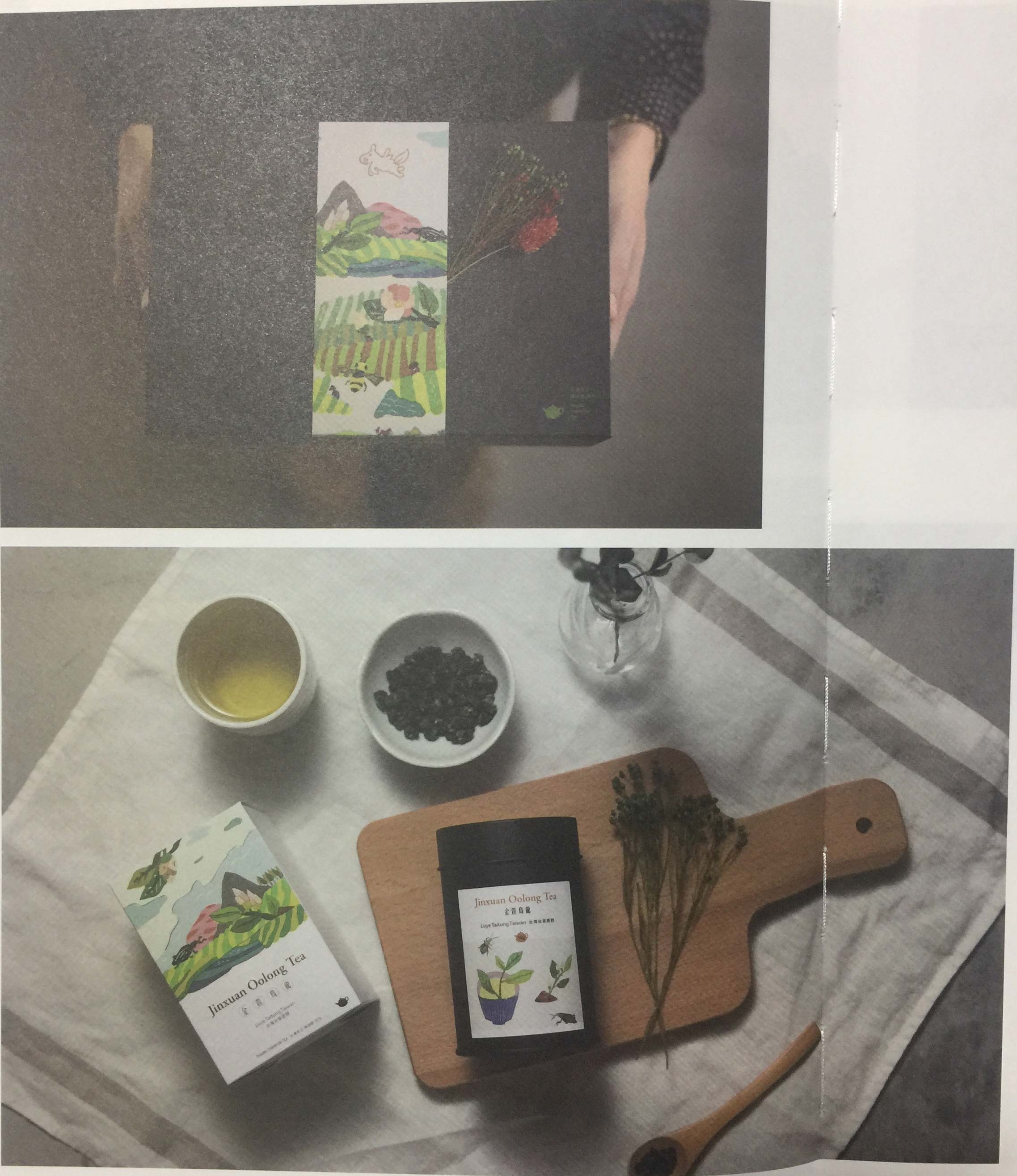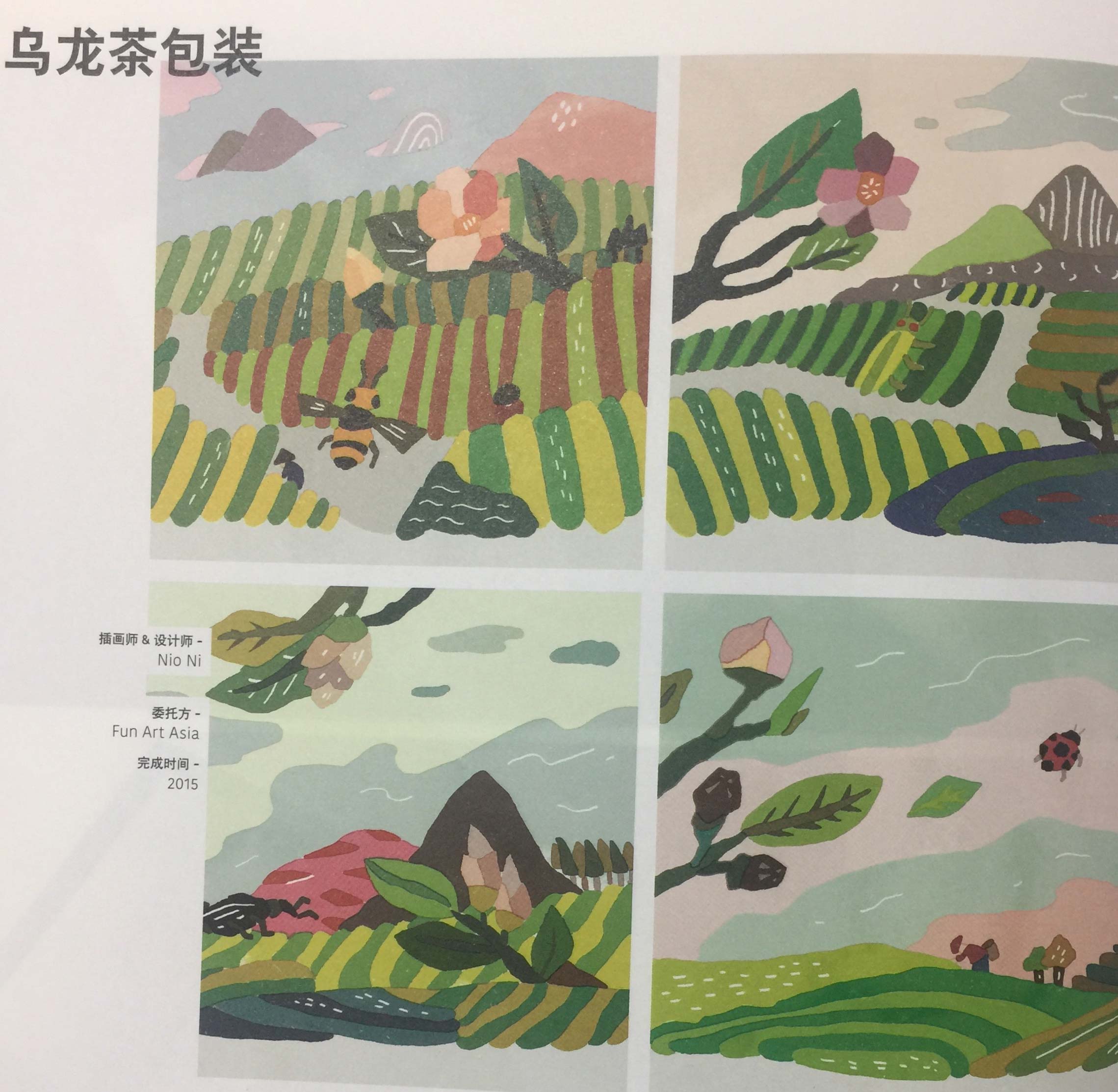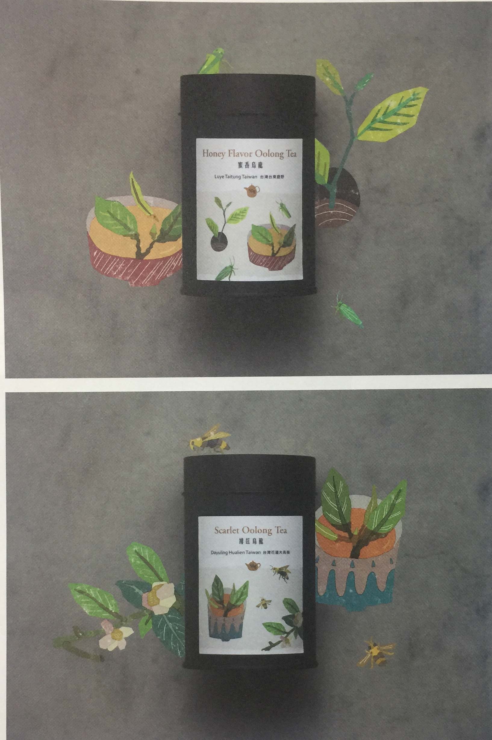 這一系列的包裝插畫以簡單的幾何形狀構(gòu)成,呈現(xiàn)出現(xiàn)代簡約的氛圍。靈感來自茶園的風景,云霧繚繞的山巒,充滿生氣的茶葉嫩芽和穿梭在茶園的生物。每款外包裝都有屬于自己的風景,四款包裝可合成一幅中國臺灣茶鄉(xiāng)的風景,由此吸引消費者收集四款不同的包裝,擺放于室內(nèi)。沒有農(nóng)藥的茶園生有各類不同的昆蟲,每款茶罐搭配不同昆蟲和茶水的顏色,呈現(xiàn)出原始天然的樣貌,以最直接的方式將當?shù)氐娘L景傳達給消費者,使其可以想象在茶園內(nèi)喝茶的感受。