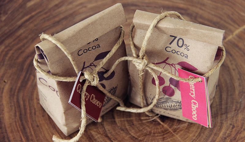 因此,櫻桃巧克力在產(chǎn)品包裝設計上使用棕色再生紙和麻繩,使產(chǎn)品具有自然無添加的感覺,包裝配色方案是棕色和褐紅色的色調(diào),標志是手工生產(chǎn)的可可植物和櫻桃模板之間的混合物。產(chǎn)品有大小兩種尺寸包裝供消費者自行選擇。