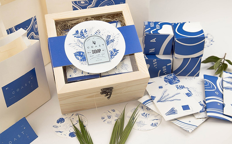 分別在五個(gè)海島對(duì)應(yīng)放置包裝盒,繪制插畫,在辨識(shí)度上盡力做到絕對(duì)閾值。平面地圖與包裝布功能性用兩,實(shí)用性二合一。以此概念,于是仿真繪制了80X80的平面藻類等深線地圖,用熱轉(zhuǎn)印加工打印出布質(zhì),地圖共用5個(gè)海灣,均為真實(shí)地點(diǎn),其中地圖被兩條海岸線分為三個(gè)地區(qū),分別是淺水區(qū)、中水區(qū)、深水區(qū)。在地圖上面,分別放置對(duì)應(yīng)的海藻包裝表示地標(biāo)。地圖的作用是展開(kāi)來(lái)是一張可視地圖,扎起來(lái)可以包裝木盒。既是功能性指示,又是美觀的作用。其中主視覺(jué)為地圖,中間穿插三種藻類的插畫用作點(diǎn)綴。包裝整體用白色與藍(lán)色的搭配,材質(zhì)環(huán)保,百分之九十五純手工制作。